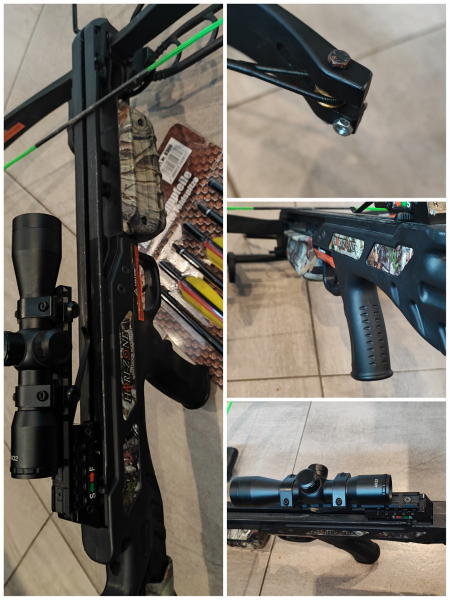 Ich kenne mich mit Bögen absolut nicht aus und kann leider nur bedingt Anbaben machen. Wie auf dem Bild zu sehen ist, ist der Bogen mal mit einer Schreube repariert worden. Funktioniert aber auch so. Mit dabei ist eine neue Packung Pfeile, Zielfernrohr. verstellbarer Schaft.