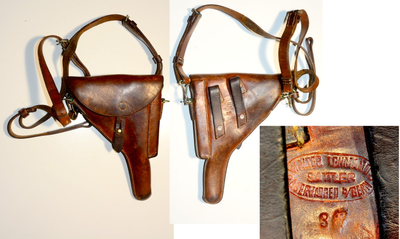 Original Pistolentasche zur schweizer Luger Pistole Modell 1906 bzw. 1906/29, hellbraunes Kernleder, hergestellt von "Walter Lehmann Oberwanger b. Bern" 1937, guter Zuztand und komplett mit Schulterriemen