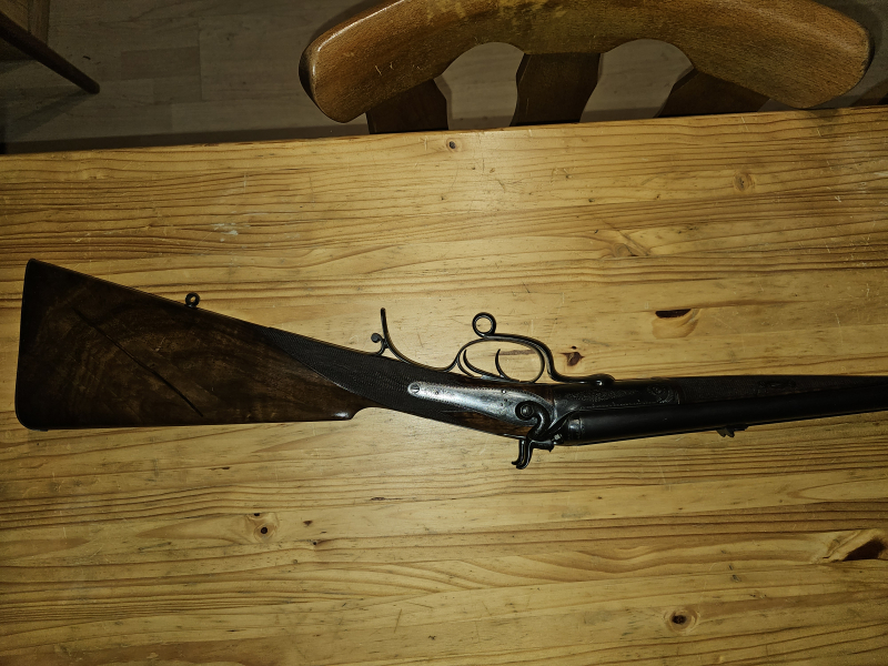 Sehr schöne und seltene Grosswild Hahndoppelbüchse im noch selteneren Kaliber 450 No.1 von J.Lewis ,Birmingham in der Tradition alter englischer Doppelbüchsen gebaut.Die Waffe wurde seinerzeit für die Kolonien in Afrika und Indien gefertigt.Durch sehr moderates Rückstoss Verhalten kann sie aber auch problemlos auf europäisches Wild eingesetzt werden.Matrizensatz und Restmunition sind Bestandteil der Auktion.