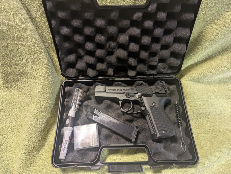 Neuwertige UMAREX Walther P88 9mm - es wurden ungefähr 20 Schuss abgegeben. Keine Gebrauchsspuren. Mit dabei ein Reinigungsset, ein einzelner 15-mm Abschussbecher ( gebraucht) und ein 4-schüssiger Abschussbecher ( gebraucht). Die Pistole wurde aus Rücksicht für unseren Hund nie ernsthaft benutzt. Jetzt lebt mein Hund nicht mehr aber ich will den anderen Tieren diesen Lärm nicht antun. Wird in einem kleinen UMAREX-Köfferchen geliefert. Verkauft wird alles was auf dem letzten Bild zu sehen ist. WICHTIG: Verkauf nur gegen Altersnachweis.