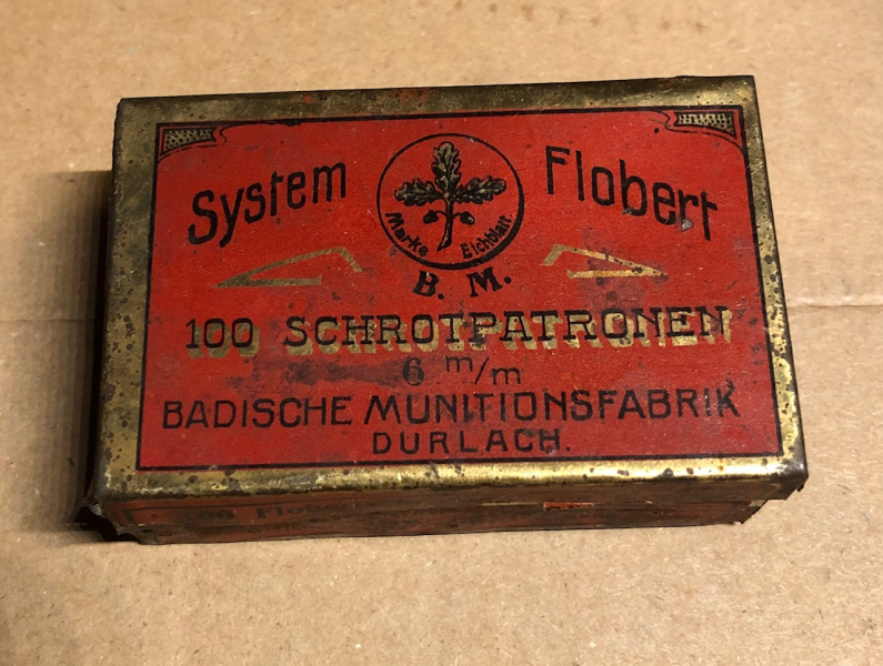 Blechschachtel 100 Schrotpatronen 6mm Badische Munitionfabrik Durlach (Sammler)