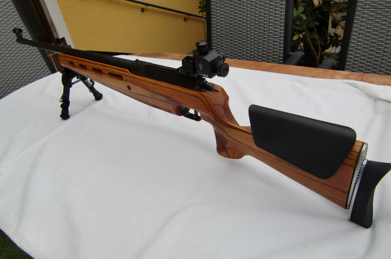 Stahlteile matt brüniert, 670 mm langer Matchlauf mit hochwertigem Anschütz Matchdiopter 20er klick, und 2 Bein.