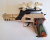 Farbe: silber mit blau/grün/braunen Griffschalen - Magazinkapazität: 8 Schuss (cal. 4.5 mm (.177) Diabolos – Mündungsgeschwindigkeit: 130 m/s – Gesamtlänge: 230 mm - Lauflänge: 152 mm – Schlagbolzensicherung durch Einrasten in Hahnsicherungsraste / Abzugssicherung bei geöffnetem Verschluß – Gewicht: 1160 g - Mit RWS Red-Dot-Sight Leuchtpunktvisier - + 2 extra Trommel - Sammlungsauflösung – guter Zustand mit leichten Gebrauchsspuren – Mit Gebrauchsanleitung - Frei ab 18 Jahren -