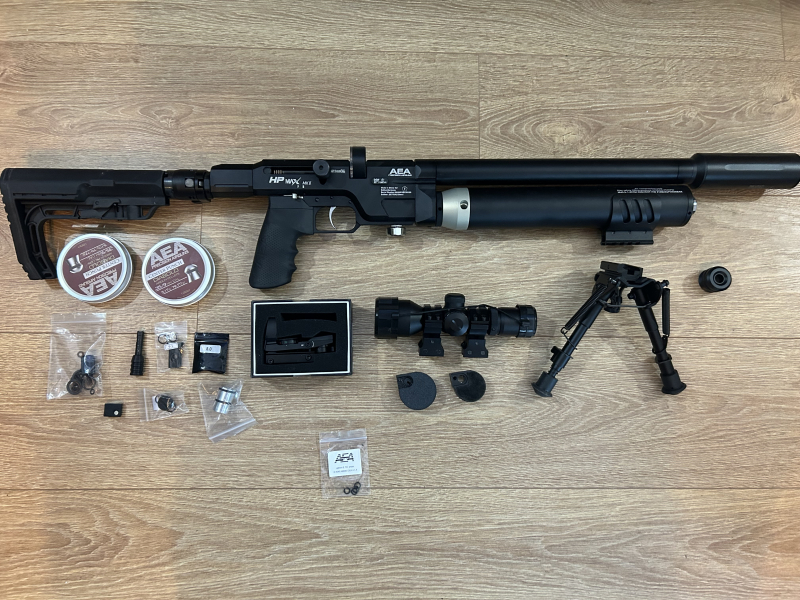 Zielfernrohr 3-9x40, Schalldämpfer, 3 Magazine, Zweibein + Befestigung und 200 Diabolos dazu.