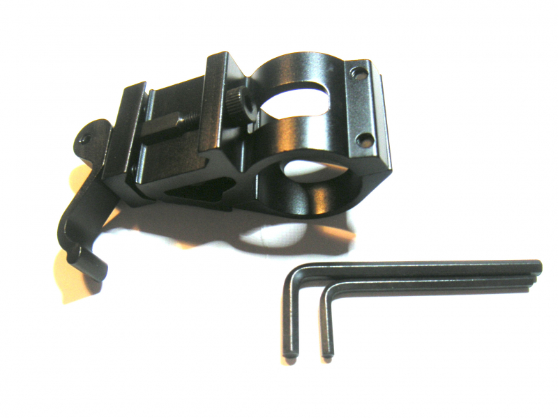 Ich verkaufe die abgebildete Hebel-Klemmmontage zur Befestigung eines runden Gegenstandes (z. B. Optik, Infrarot-Leuchtmittel, Taschenlampe) auf einer Picatinny-Rail oder einem Picatinny-Mount.