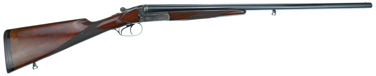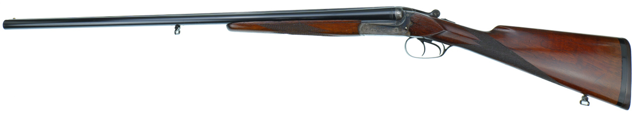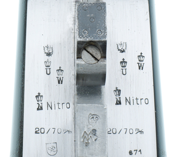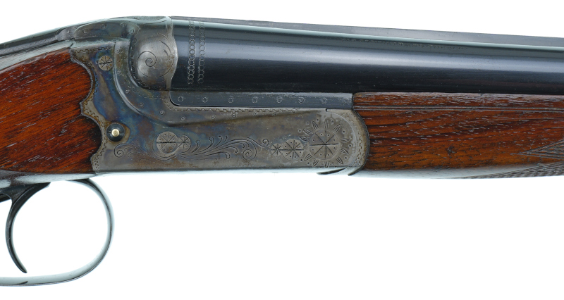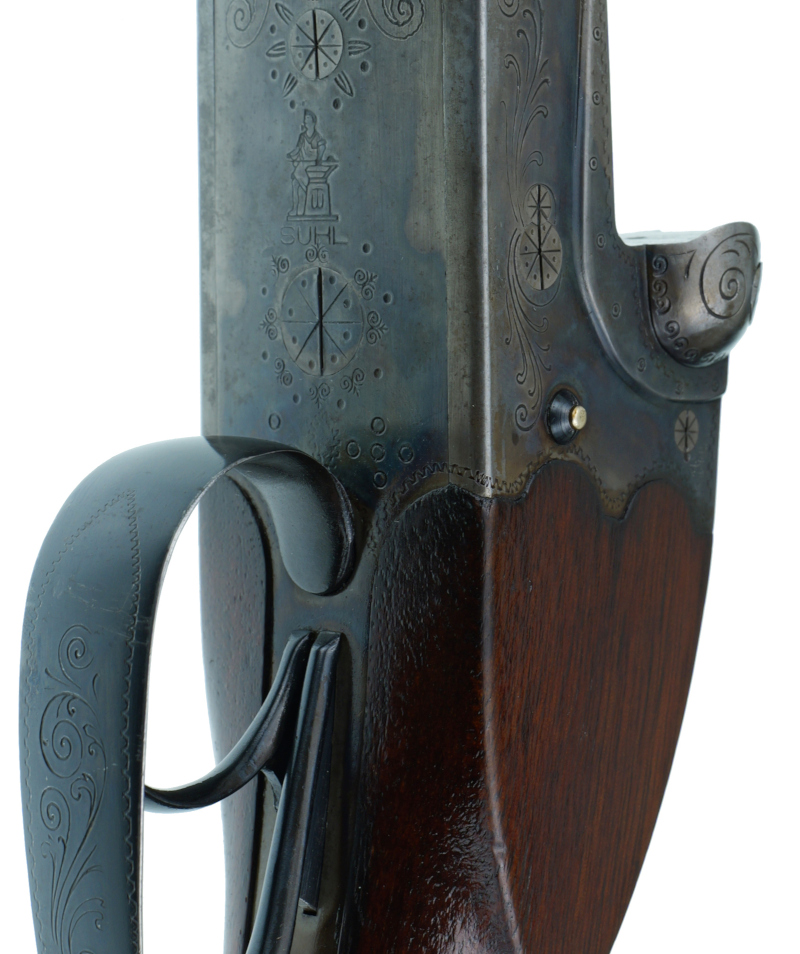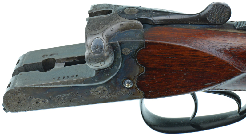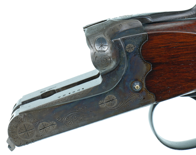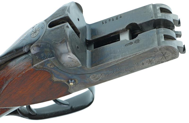Mit Ejektor ( a la Holland & Holland ) und buntmamoriertem Systemkasten mit Arabesken - Randstichgravur .