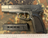 Pistole Browning Mod. GBDA 8 im Kaliber 8 mm K. Made in Germany! FN High Power Nachbildung. Kunststoffgriffschalen, PTB 389. Sie besitzt einen funktionierenden Schlittenfanghebel (nicht angedeutet, wie bei manchen Modellen). Gebrauchsspuren. Ohne weiteres Zubehör.