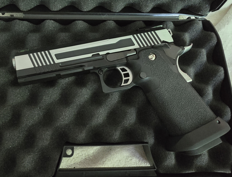 Hallo, biete hier eine AW Custom HX 1001, Gas, schwarz/silber in 6mmBB. Die waffe ist im neuwertigen Zustand, wurde nicht geschossen und hat auch keine gebrauchspuren.