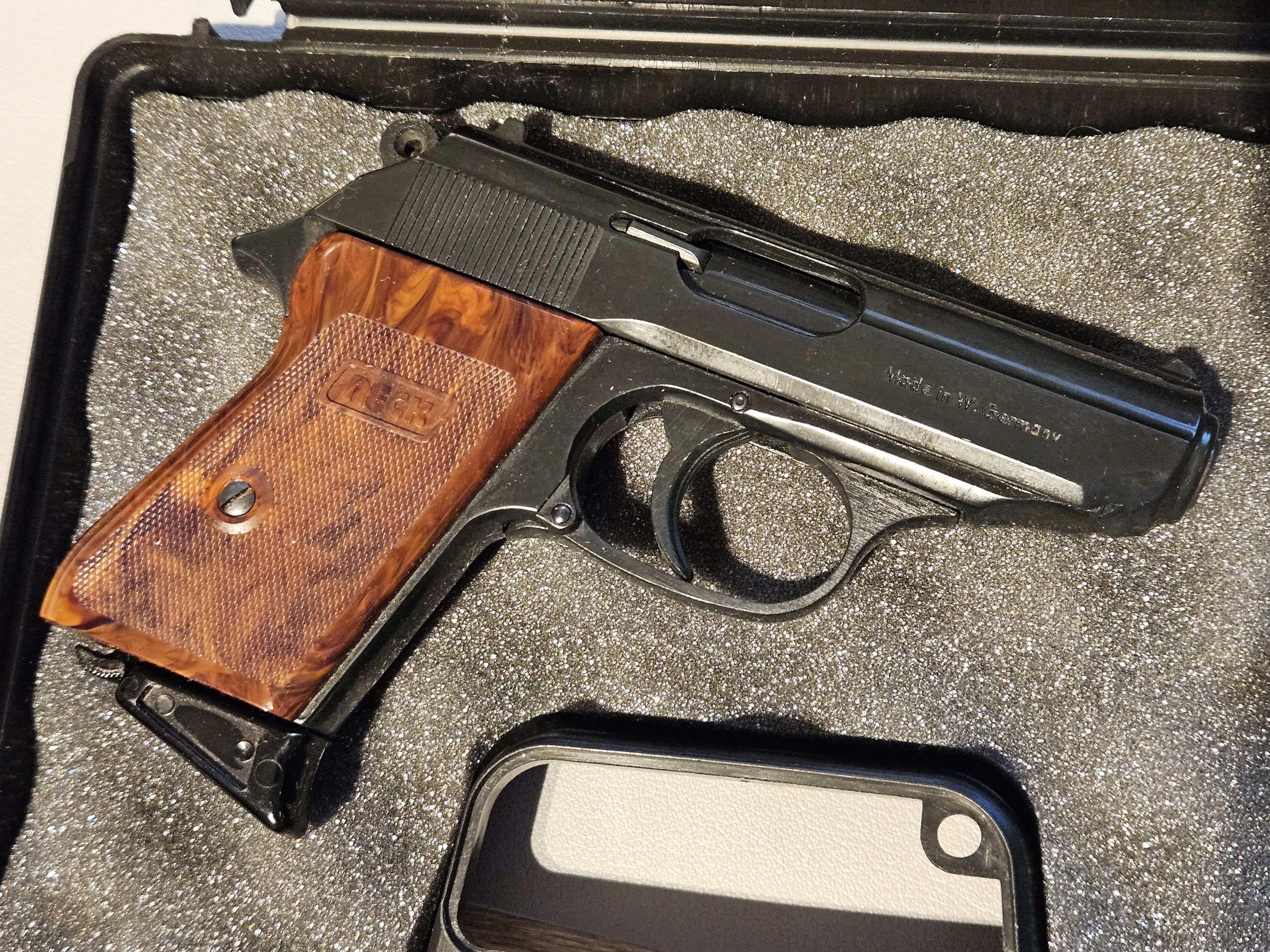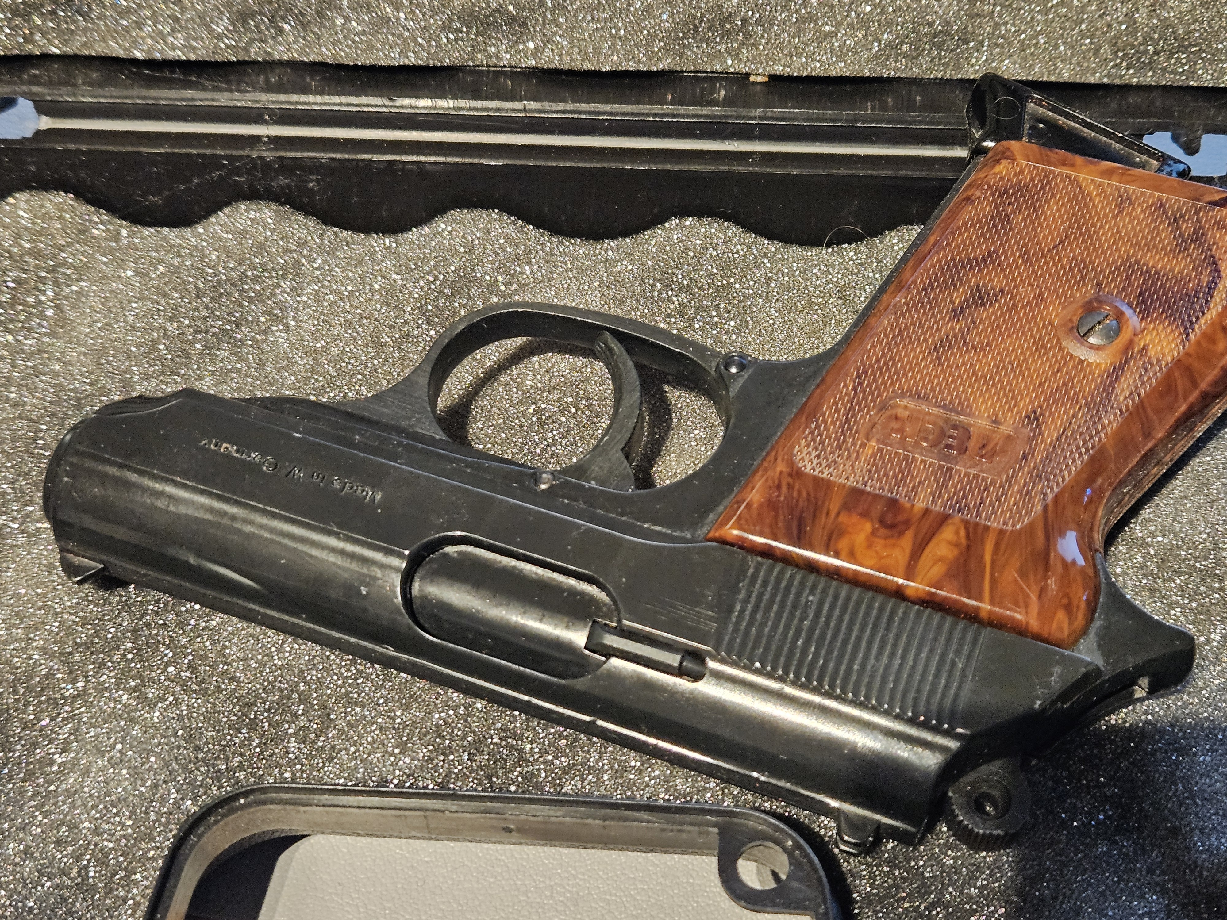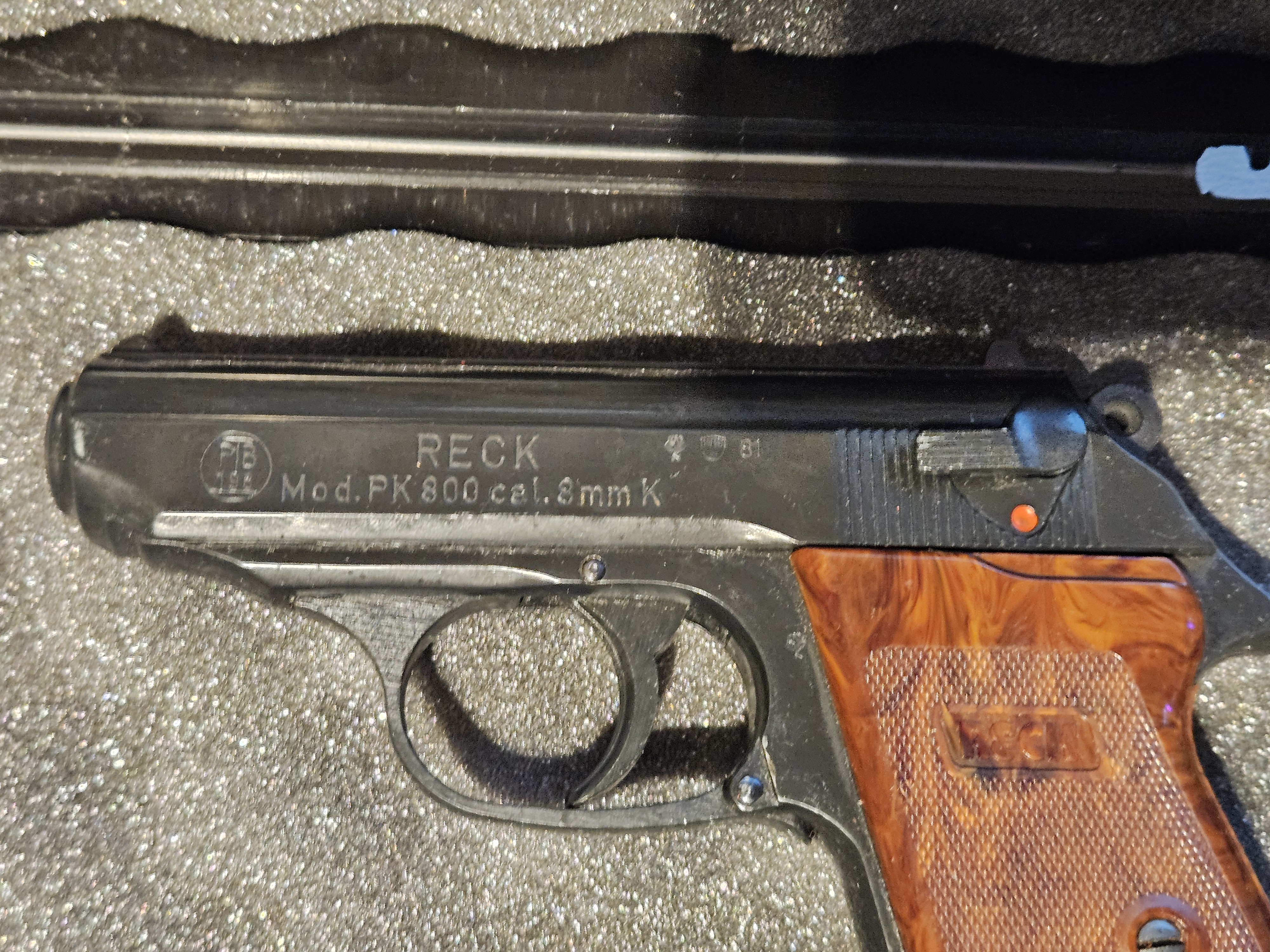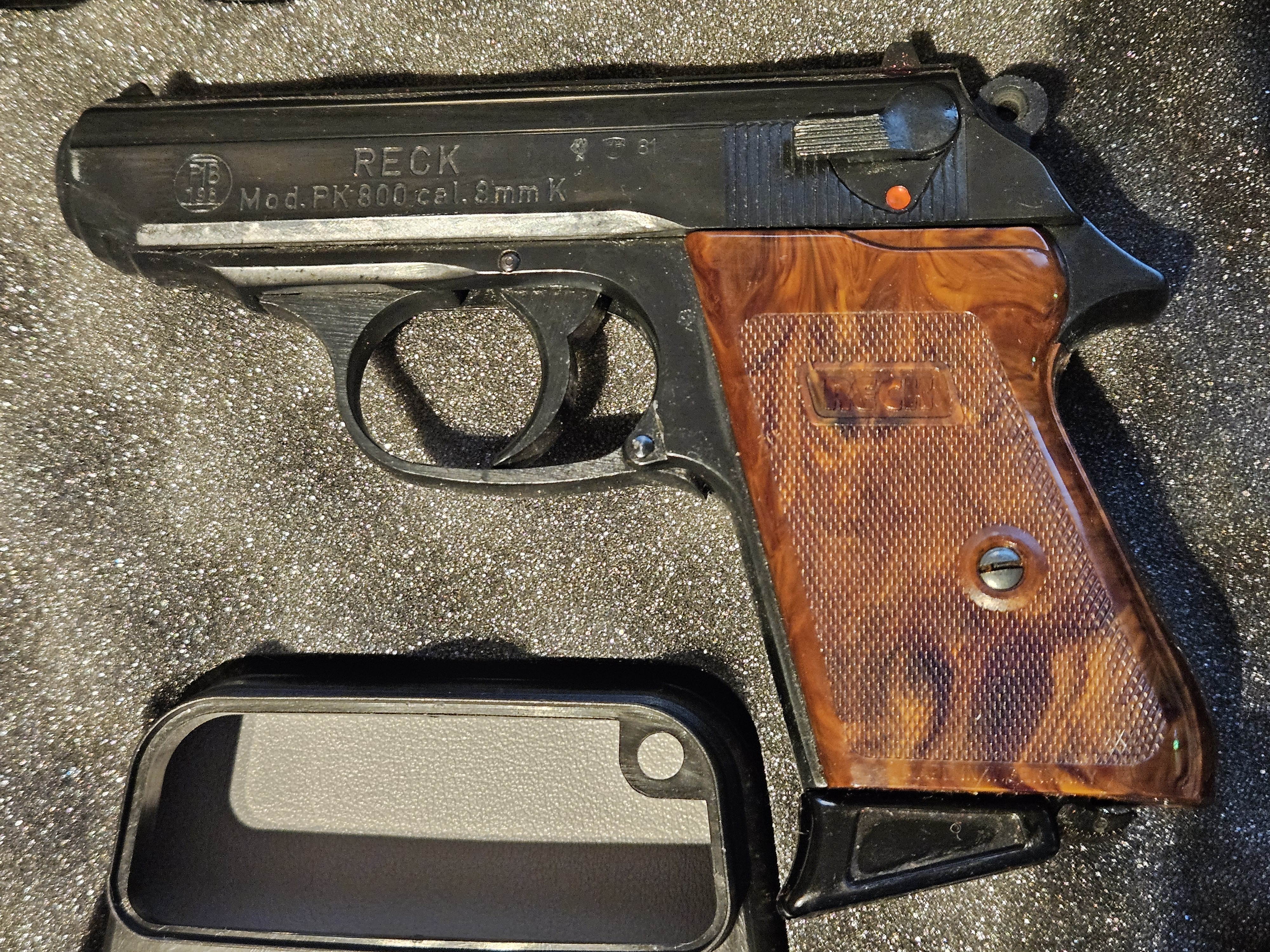 Reck Mod PK800 cal. 8mm K in gebrauchtem Zustand mit kleinen Gebrauchsspuren (Abrieb) insb. am Verschluss. Die beliebte PTB 196 ohne geschwächtes Patronenlager und wenig auffälliger Laufsperre. Verkauf ohne den abgebildeten Koffer.
