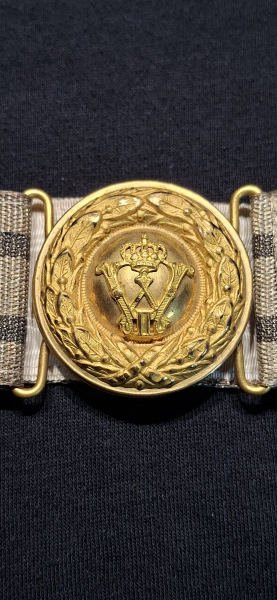 Aus meiner Sammlung eine Feldbinde/Damengürtel der gehobenen Gesellschaft. Diese wurde bei feierlichen Zeremonien der Regimenter getragen . Das Feldbindenschloß hat natürlich die Originale Größe und ist identisch mit den der Herren.Der Gürtelstoff ist mit weissen Moirre.Seltenes Stück.