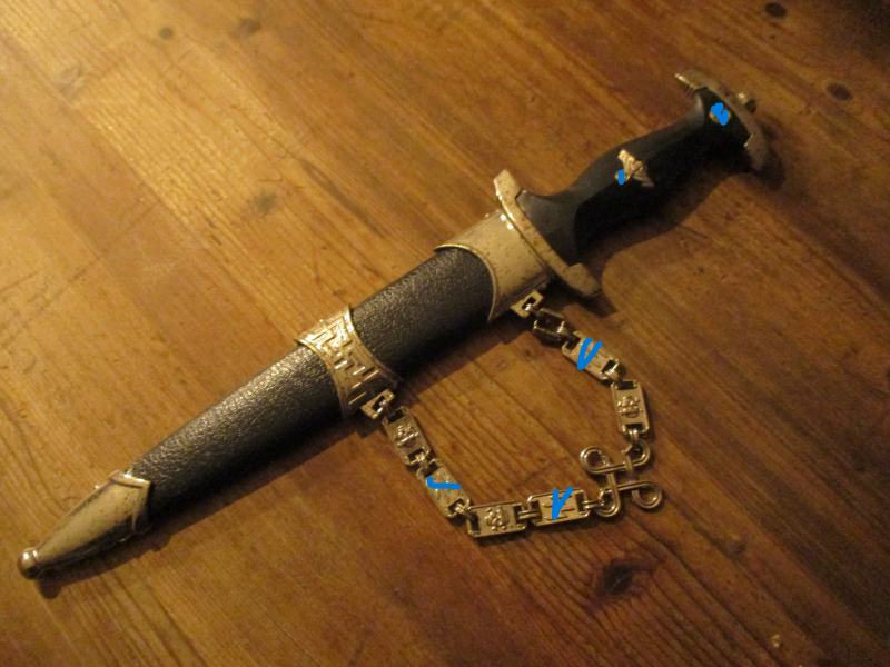 SS-Kettendolch, Scheide lederüberzogen, RZM Nummer nicht mehr erkennbar. Zustand siehe Fotos.
