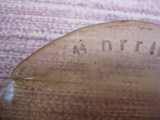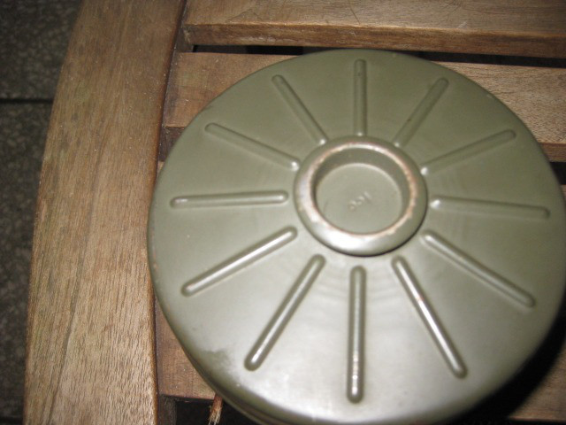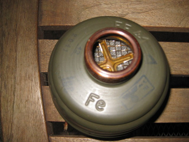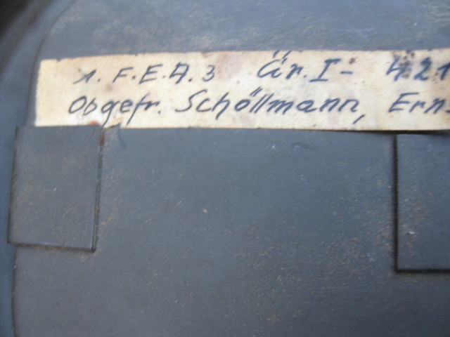 In der Innenklappe befindet sich noch eine Ersatzscheibe von 1944 Hersteller: nrr. Der Deckel des Ersatzscheibenbehälters ist noch personifiziert auf einen Obergefreiten der Wehrmacht s. Foto. Sie hat jedoch ein Manko: Einer der vier Halteriemen am Kopfstück ist abgerissen und fehlt.