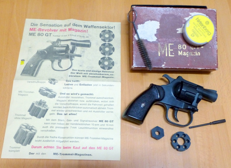 ME 80 GT Kal. 6mm Flobert Knall , 6 schüssig mit Ersatzmagazin zum Schnell-Laden , Lauf für 15mm Signalmunition ausgelegt , Trommelstift lässt sich zum Ausschwenken und Nachladen herausziehen und dient auch als Stift um die leeren Kartuschen auszustoßen , voll funktionsfähig im original Karton mit Anleitung und ca. 65 Schuss Munition in der original Hirtenberger Box , Sammlerstück !! Zustand siehe Fotos ,