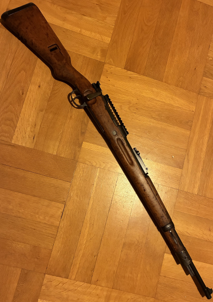 Der Schaft wurde durch einen wahrscheinlich deutschen militärischen Schaft mit 7,62 Prägung ersetzt. Der Schaft wurde schon mal nachgearbeitet und gewachst, er fühlt sich glatt an und pappt nicht.