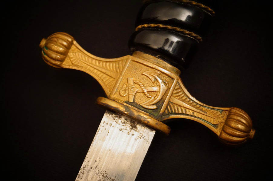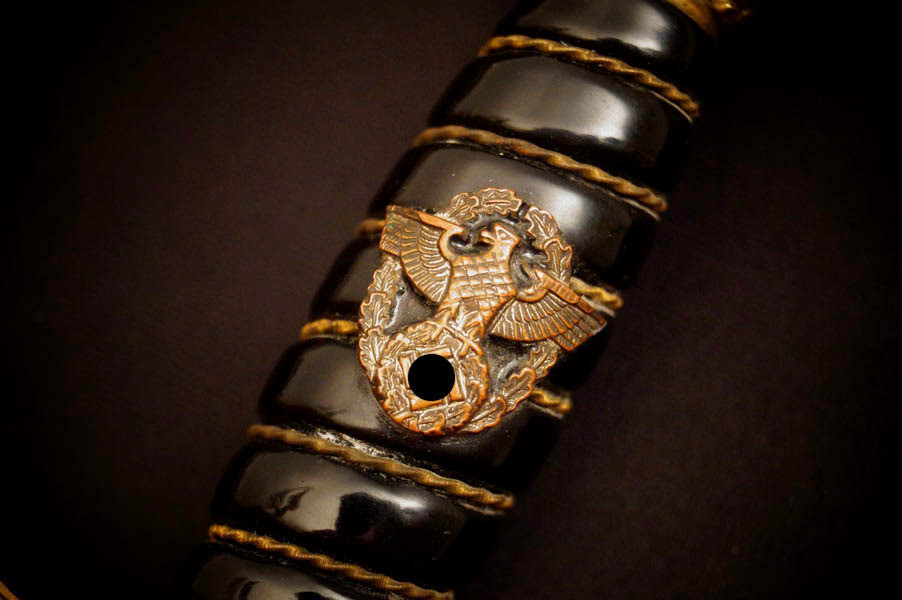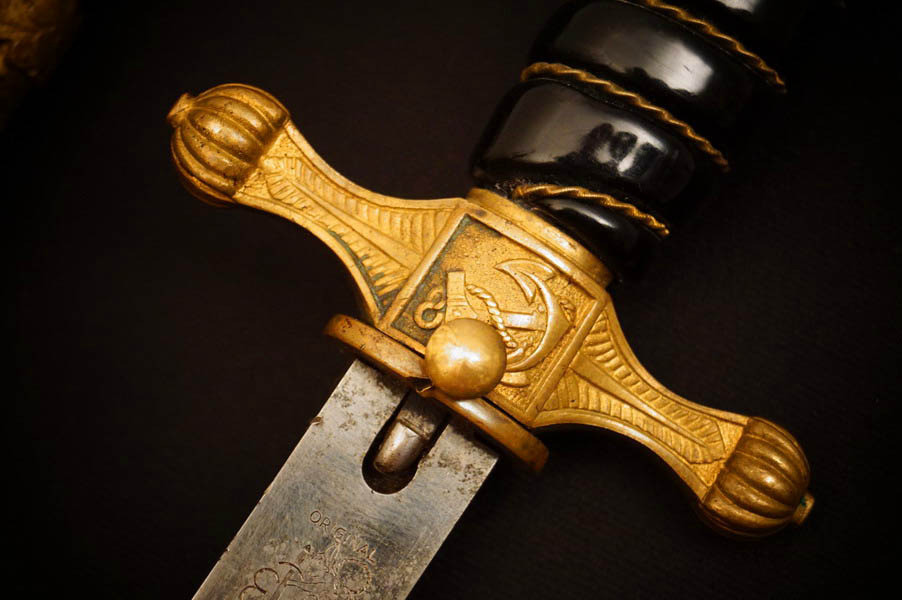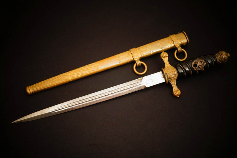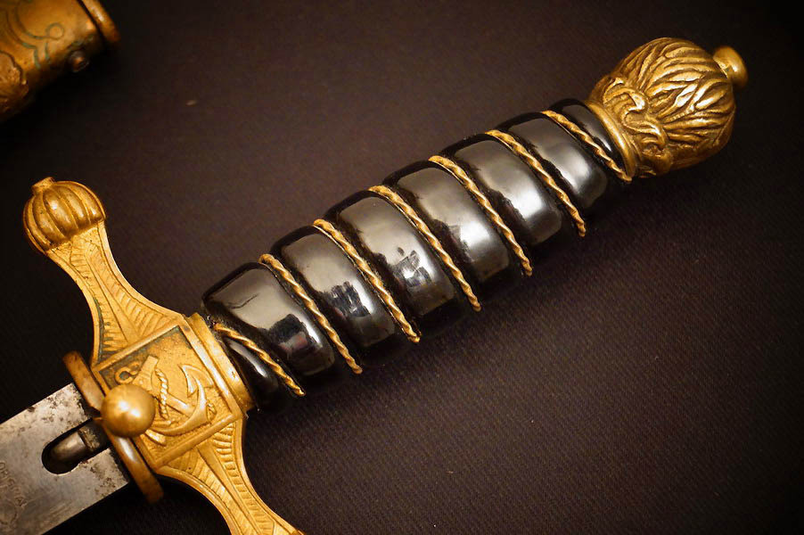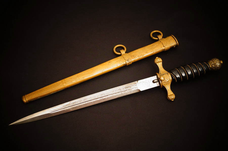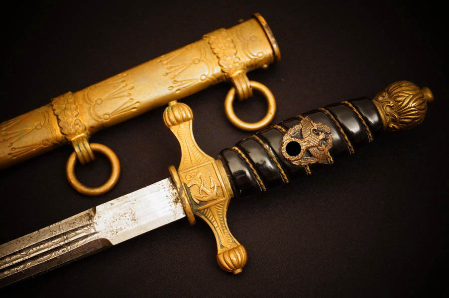 Zustand siehe Bilder. Bilder sind Gegenstand der Beschreibung. Der Dolch ist in allen Teilen matching ! Mehrteilige Bronzescheide, vergoldet. Guter Sitz mit funktionsfähigem Drücker. Klinge geschmiedet und mit Zierätzung. Hersteller Eickhorn geprägt in der Klinge. Griffstück aus Holz/Cellon in schwarz mit feinem Drahtgespinst umwickelt. Flammknauf wie die Parierstange aus Bronze vergoldet. Griffadler aus Cupal geprägt. Schöner getragener Dolch der Wasserschutz Polizei aus dem WK2.