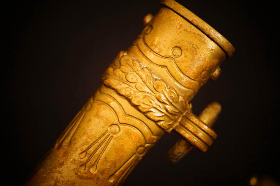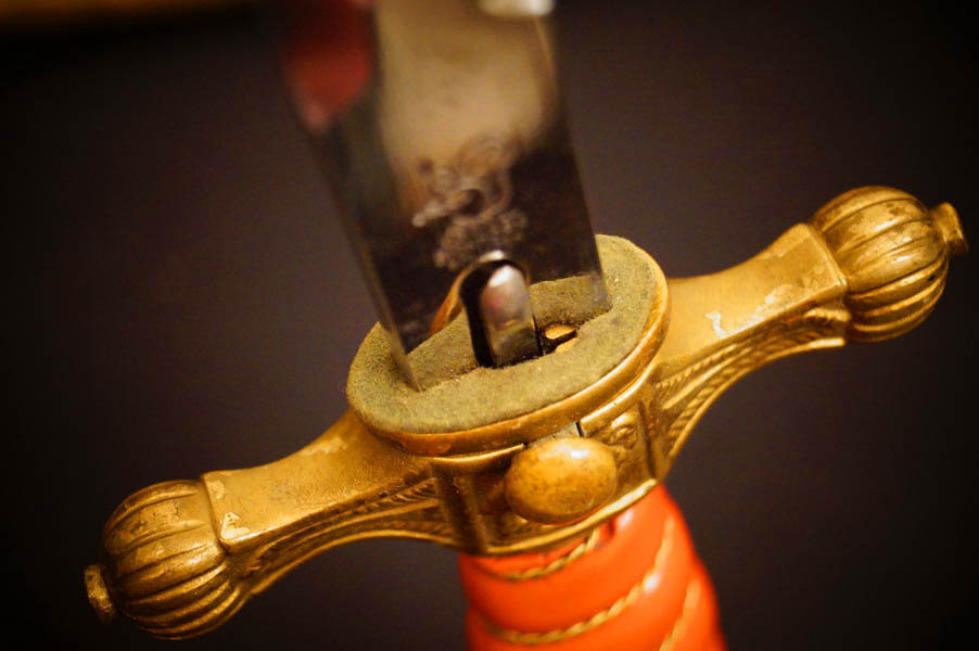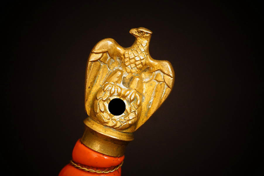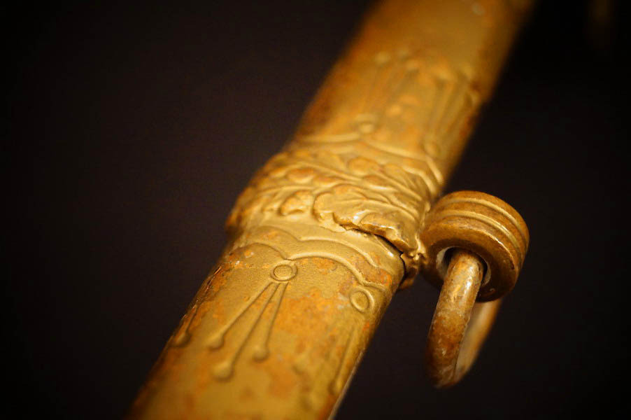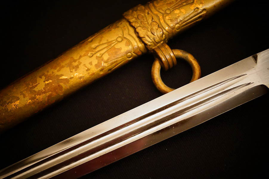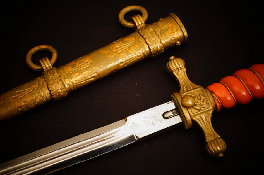 Zustand siehe Bilder. Bilder sind Gegenstand der Beschreibung. Mehrteilige Bronzescheide mit umlaufenden Blitzen. Geschmiedete Klinge mit beidseitiger doppelter Kehlung. Hersteller Eickhorn geprägt in der Klinge. Parierstange und Knauf wie alle anderen Teile matching und aus Bronze vergoldet. Griff ohne Schäden und in schönem orangenem Farbton. Getragenes Stück.