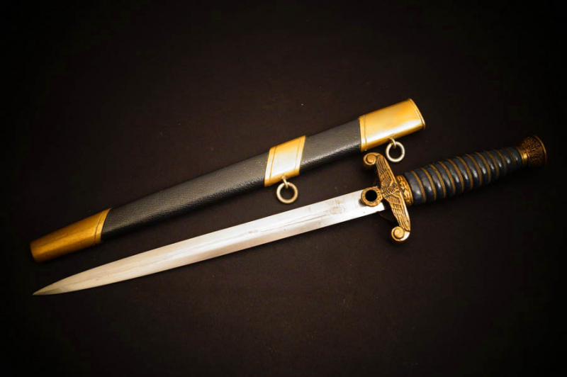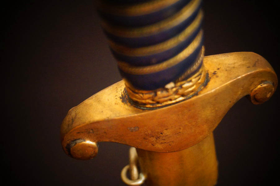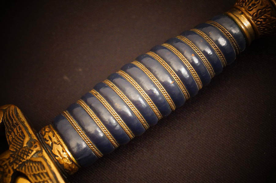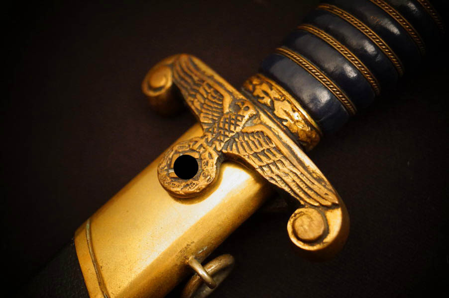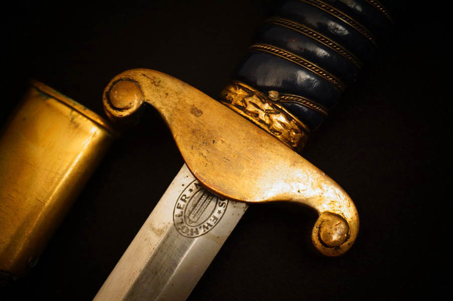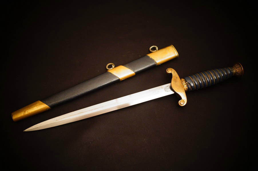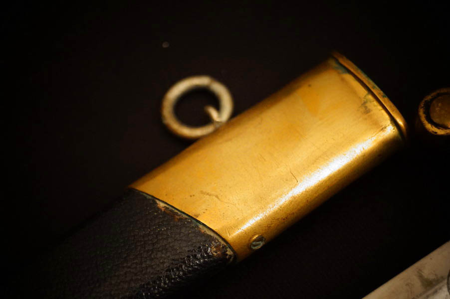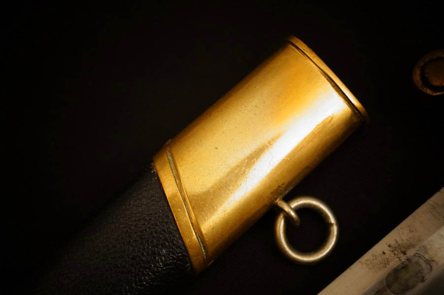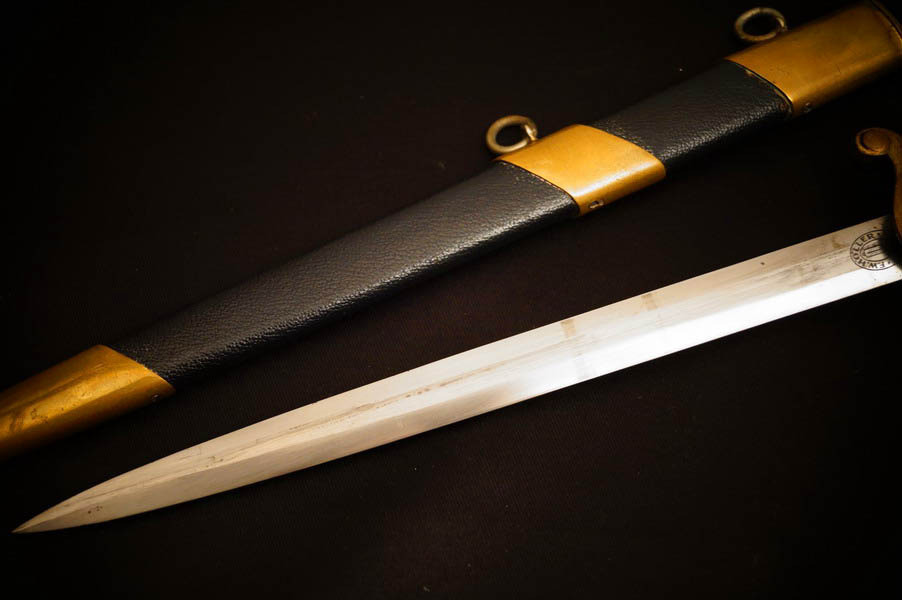 Zustand siehe Bilder. Bilder sind Gegenstand der Beschreibung. Stahlscheide und mit vergoldeten Bronzebeschlagteilen. Die Beschlagteile der Scheide sind mit Madenschrauben seitlich verschrauft - es fehlt keine Schraube. Teils Nummern an den Beschlagteilen. Saffianleder an der Scheide und am Griff. Griff aus Holz, keine Schäden und noch mit der feinen Drahtwicklung. Knauf, Parierstange und Griffring aus Bronze vergoldet. Überwiegend noch perfekte Vergoldung. Stück ist getragen und matching ! Eisenklinge, geschmiedet. Ultra seltener Dolch !!!