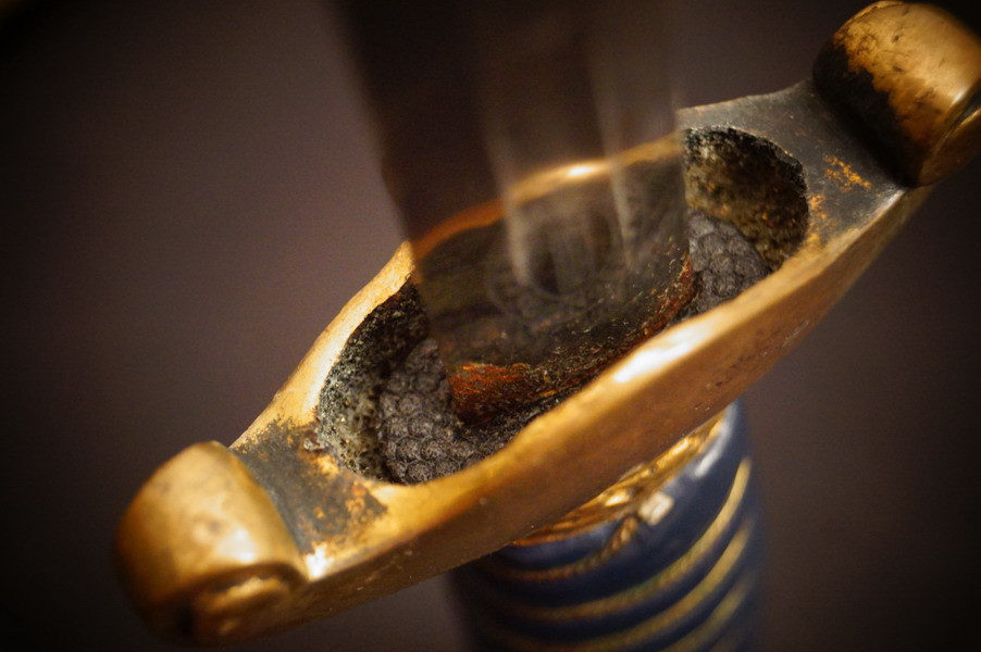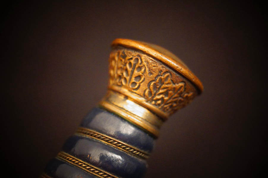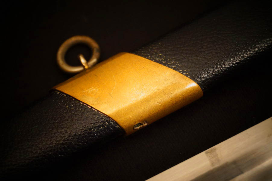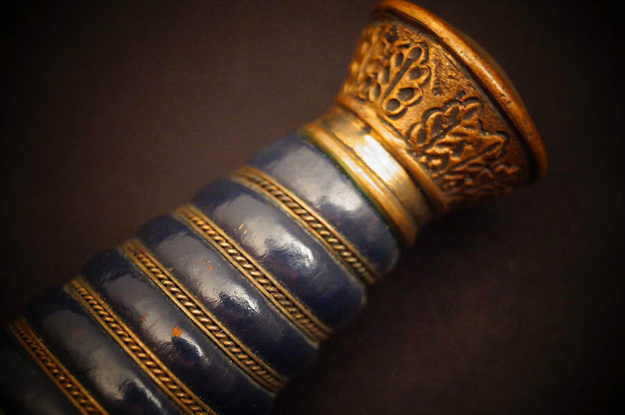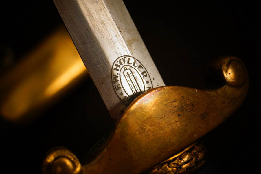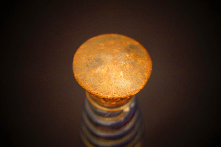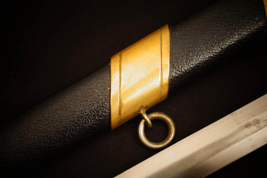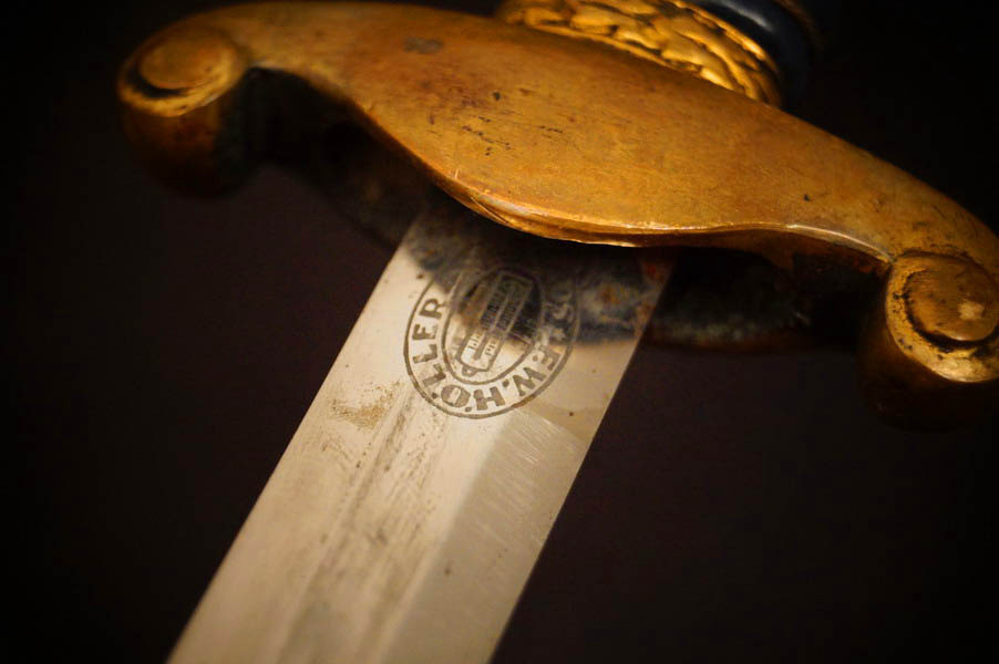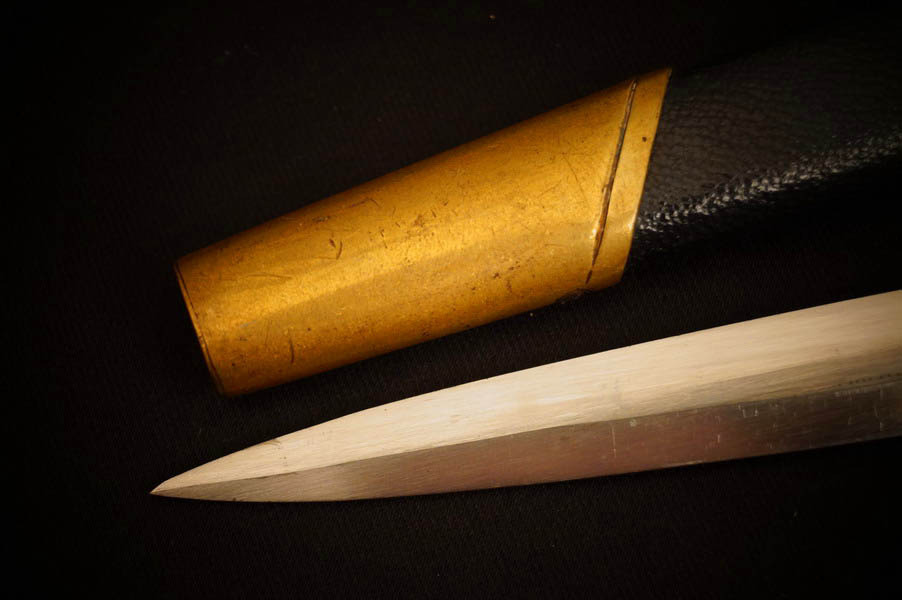 Zustand siehe Bilder. Bilder sind Gegenstand der Beschreibung. Stahlscheide und mit vergoldeten Bronzebeschlagteilen. Die Beschlagteile der Scheide sind mit Madenschrauben seitlich verschrauft - es fehlt keine Schraube. Teils Nummern an den Beschlagteilen. Saffianleder an der Scheide und am Griff. Griff aus Holz, keine Schäden und noch mit der feinen Drahtwicklung. Knauf, Parierstange und Griffring aus Bronze vergoldet. Überwiegend noch perfekte Vergoldung. Stück ist getragen und matching ! Eisenklinge, geschmiedet. Ultra seltener Dolch !!!