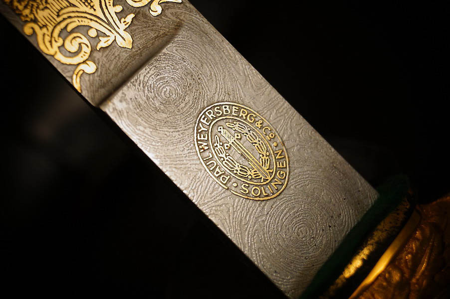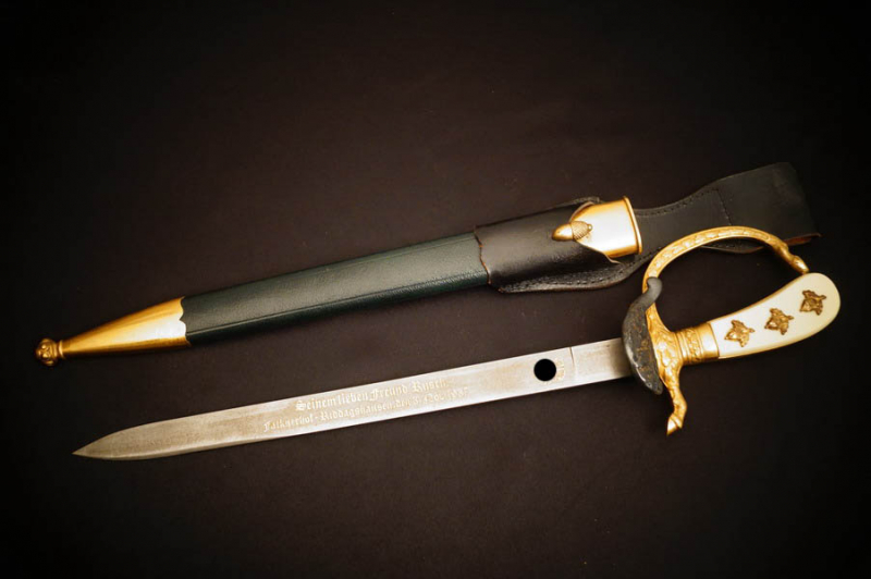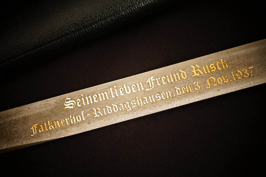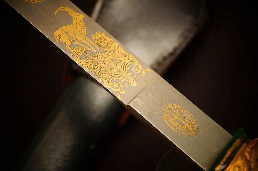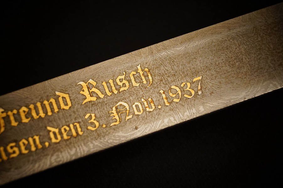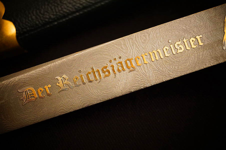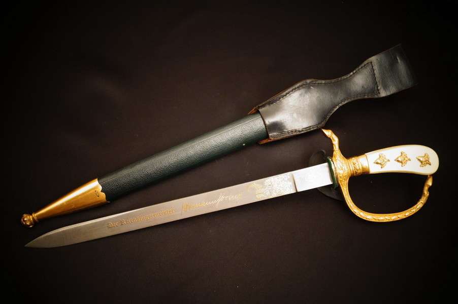 Zustand siehe Bilder. Bilder sind Gegenstand der Beschreibung. Scheide aus günem Leder und mit perfekt vergoldeten Beschlagteilen. Saugender Sitz der Klinge. Klinge aus echtem Damast Stahl - auf dem Klingenrücken auch deutlich erkennbar. Ätzung von Schrift, Hersteller und Deutsche Jägerschaft Abzeichen erhaben und vergoldet. Gefäß aus Bronze wie auch das Stickblatt. Griffschalen aus Cellon mit allen Eicheln dran. Scheinbar war das Stichblatt, welches auch aus Bronze ist, anders vergoldet und es ist in der Zeit stark angelaufen. Das Stück ist matching in allen Teilen. Mit dabei der Koppelschuh der dabei war. Super seltenes Stück !!!