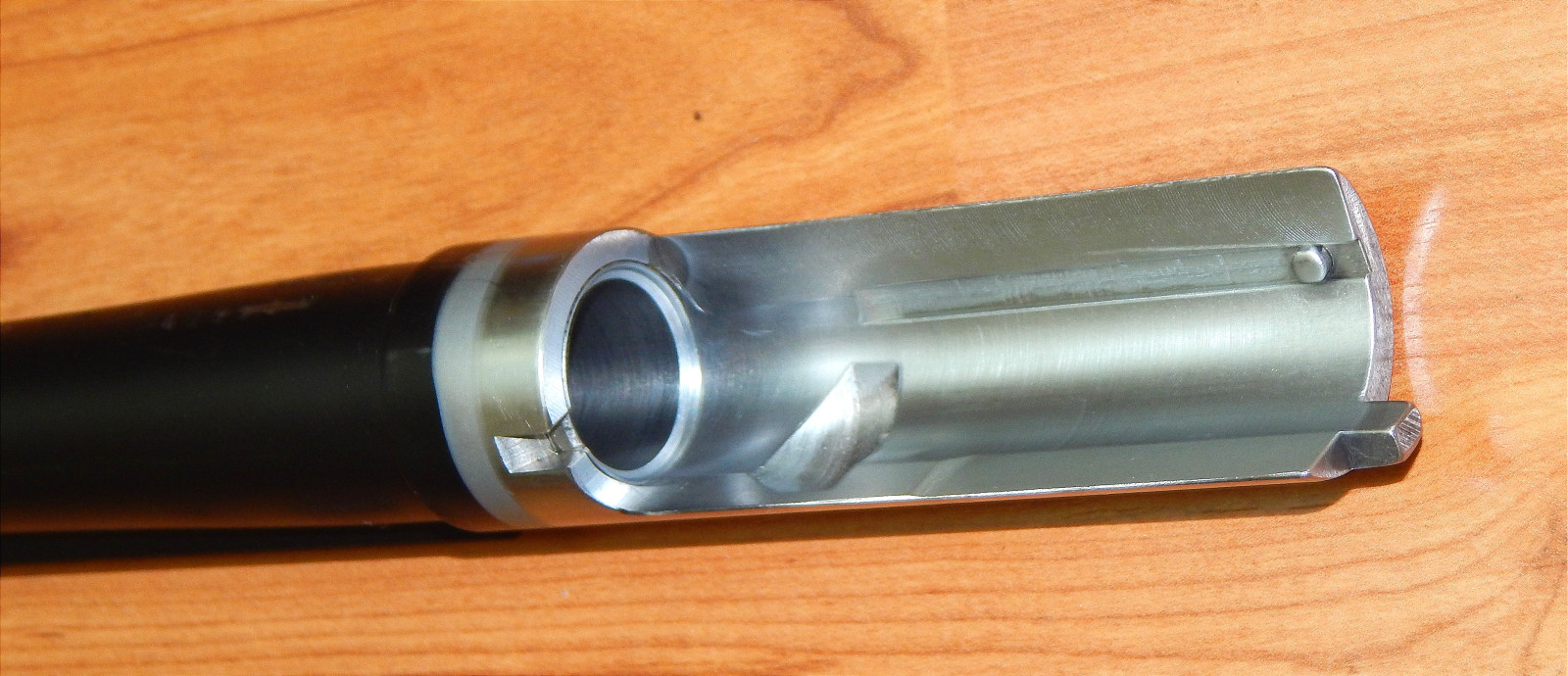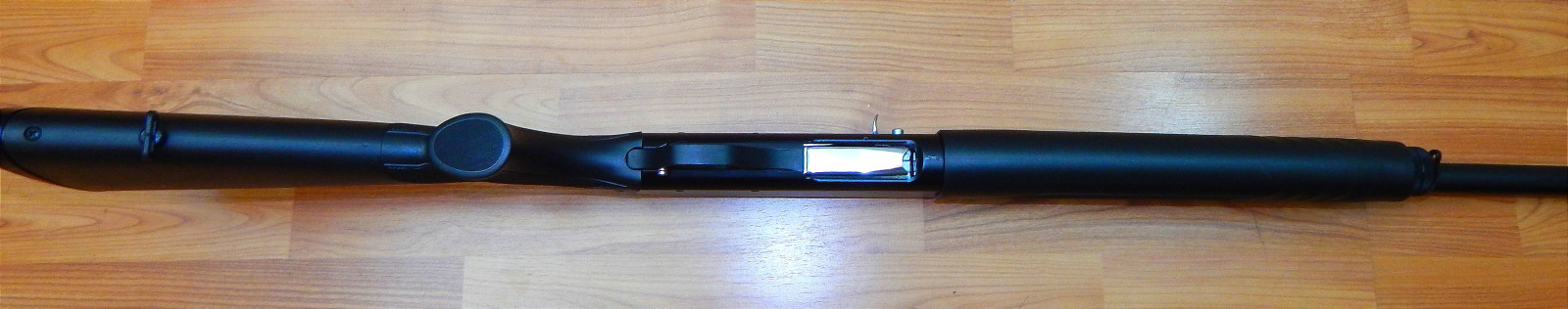 ventilierte Schiene mit Perlkorn, Wechselchoke 1/4, Finish brüniert, Schaft ist aus Kunststoff, mit Gummischulterstütze