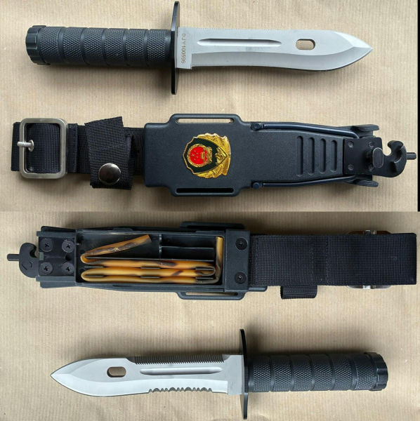 Ich präsentiere Ihnen das Dienstmesser der Polizei der Volksrepublik China. Dies ist kein Spielzeug oder Souvenirmesser vom Typ „Rambo“, sondern das reguläre Einsatzmesser der chinesischen Polizei. Im hohlen Griff des Messers befinden sich Zubehörteile, und in der Scheide befindet sich ein Gummiband, mit dem die Scheide in eine Schleuder umgewandelt werden kann. Das Gummiband kann im Laufe der Jahre unbrauchbar geworden sein, ist jedoch standardmäßig und leicht austauschbar. Das Messer verfügt über eine Seriennummer und eine Verpackung (Pappschachtel), die ich mitliefere. Sehen Sie sich auch meine anderen Auktionen an – dort gibt es interessante Exemplare von Messern und Blankwaffen.