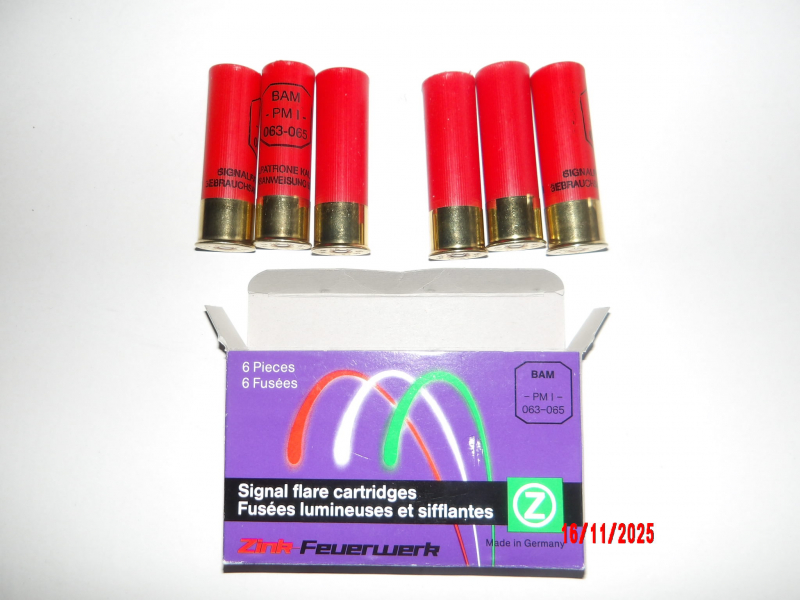 1x Orig. Packung von Zink-Feuerwerk mit 6 Leucht-u. Signalpatronen (Plastikhülse) im Kal. 16/70 mit jeweils einem Signalstern. (2 Schuß rot + 2 Schuß grün + 2 Schuß weiß). Sie sind eingestuft nach BAM-PMI 063-065 und daher laut WaffG frei ab 18 Jahren.