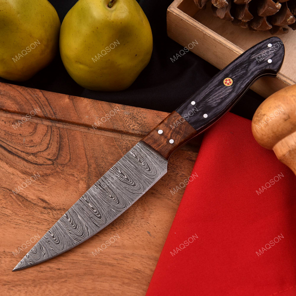 Unser Damaszener wird sehr aufwendig aus zwei verschiedenen Stahlsorten 1095 & 15N20 handgeschmiedet. Durch fünffaches Verdoppeln der Stahllagen und erneutes Schweißen wird die Anzahl der Lagen so vervielfacht. Somit besteht unser Damaszener aus 288 Lagen. Dies zeichnet unsere Messer durch seine lang bleibende Schärfe, Zähigkeit und Härte aus.