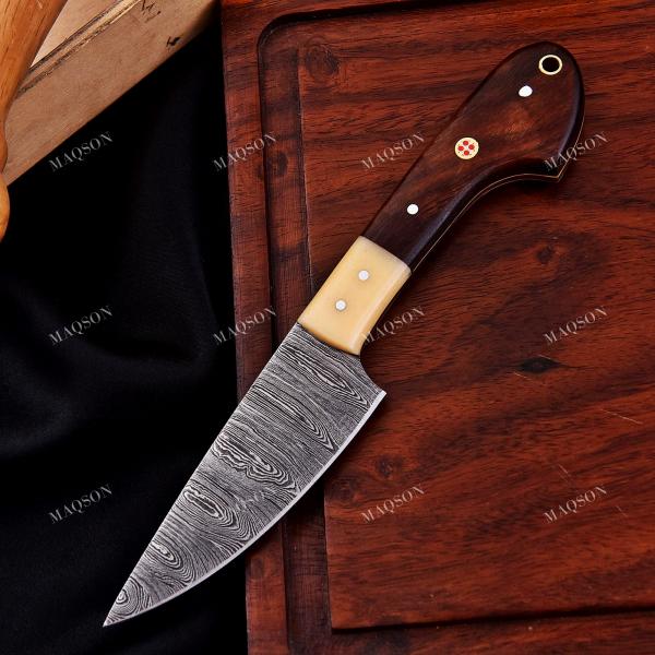 Unser Damaszener wird sehr aufwendig aus zwei verschiedenen Stahlsorten 1095 & 15N20 handgeschmiedet. Durch fünffaches Verdoppeln der Stahllagen und erneutes Schweißen wird die Anzahl der Lagen so vervielfacht. Somit besteht unser Damaszener aus 288 Lagen. Dies zeichnet unsere Messer durch seine lang bleibende Schärfe, Zähigkeit und Härte aus.