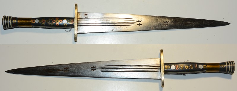 Afrikanischer Dolch mit 32,5 cm dreieckiger langer Klinge, Gesamtlänge 47,7 cm, die Waffe erinnert in der Form an einen mittelalterlichen Ritterdolch, guter unbeschädigter Zustand, keine Scheide