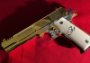 Veredelte Colt 1911 Gold, verchromte Bedienteilen, weiße Griffschalen, exklusives Sammlerstück