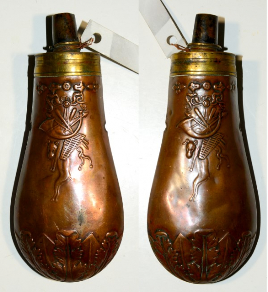 Pulverflasche aus Kupferblech mit Deckel und Tülle aus Messing, Korpus 12,8 cm, Breite 6,2 cm, geprägtes Jagdmotiv auf beiden Seiten, auf beiden Seiten unten mit Delle, die Tülle müsste neu verlötet werden, die beiden Trageösen und der Tüllendeckel fehlen.