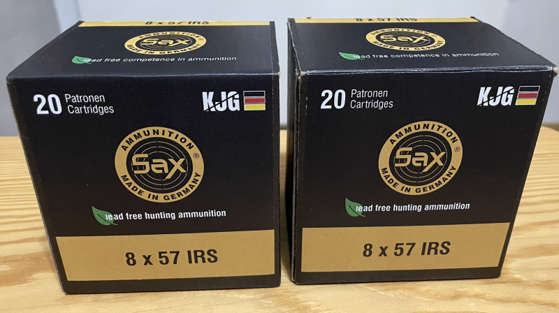 27 Schuss 8x57 IRS, SAX, KJG (bleifrei), 8.2 Gramm. Eine Packung ist neu und ungeöffnet. In der anderen Packung sind noch 7 Schuss drin. 3 Geschosse in der geöffneten Packung sind leicht angelaufen wegen Lagerung in Patronenetui. Beide Packungen haben die gleiche Losnummer.