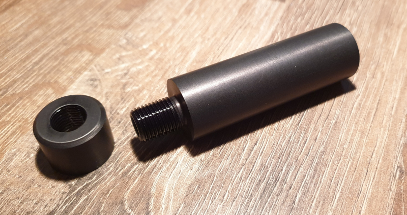 Biete hier einen hochwertigen passgenauen Schalldämpferadapter aus eloxiertem Aluminium für das Matchluftgewehr FWB 300s und 300. Der Adapter ist mit dem gängigen 1/2 x 20 UNF Gewinde versehen und eignet sich daher perfekt für die freien Luftgewehrschalldämpfer oder für einen Kompensator. Der Adapter wird anstelle des Kornträgers auf den Lauf aufgesteckt und mit einer bzw. zwei Madenschrauben fixiert. Eine dieser Madenschrauben greift auf die originale Nut im Lauf, sodass der Adapter fest sitzt und sich nicht dreht. Der Durchmesser ist auf den des Laufs bzw. das Laufgewichts angepasst, das Gewinde ist mit einer auf den Durchmesser genau passenden Mutter geschützt.