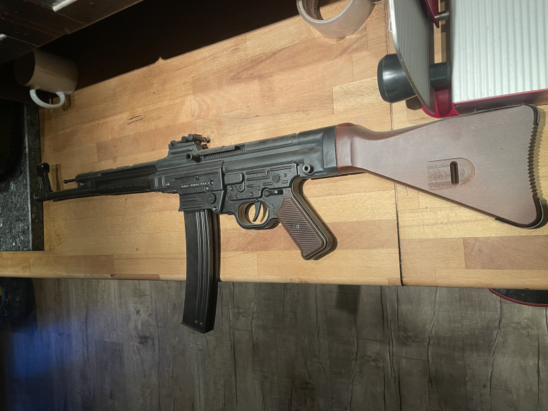 Schreckschuss Maschinenpistole im STG 44 Ausführung ungeschossen aus dem Nachlass eines Freundes jetzt hier zum Verkauf und zur Nutzung an Silvester geeignet. Kaliber 9mm Knall als Halbautomatische oder Einzelschuss konzipiert und voll funktionsfähig. Das Magazin hat eine große Kapazität. Es ist eine schwere dem Originalen angepasste Metallische Ausführung und zum verwechseln ähnlich.