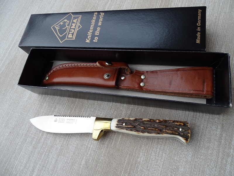 Absolute Rarität : Puma Messer ALPINIST Nr. 612331 in Handarbeit und Stainless Ausführung in einem Puma -Karton. Sehr schöne Hirschhornschalen, Backen aus Messing. Oberseite der Messingbacken nicht ganz geschlossen, siehe Bild 5-- ist stark vergrößert und fällt fast nicht auf. Extrem scharfer Sägerücken, das Messer ist unbenützt und auch nicht nachgeschliffen. Gesamtlänge 225 mm, Klinge 110 mm, Lederscheide hat Gebrauchsspuren vom Herzeigen. Fagen per e-mail, keine Garantie und Rücknahme.
