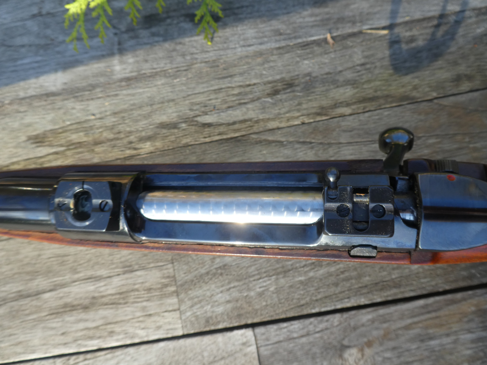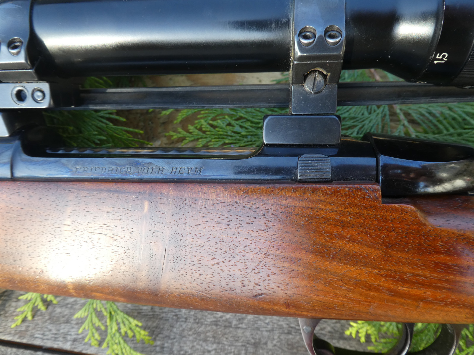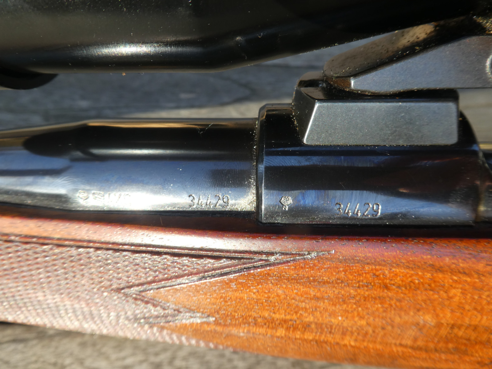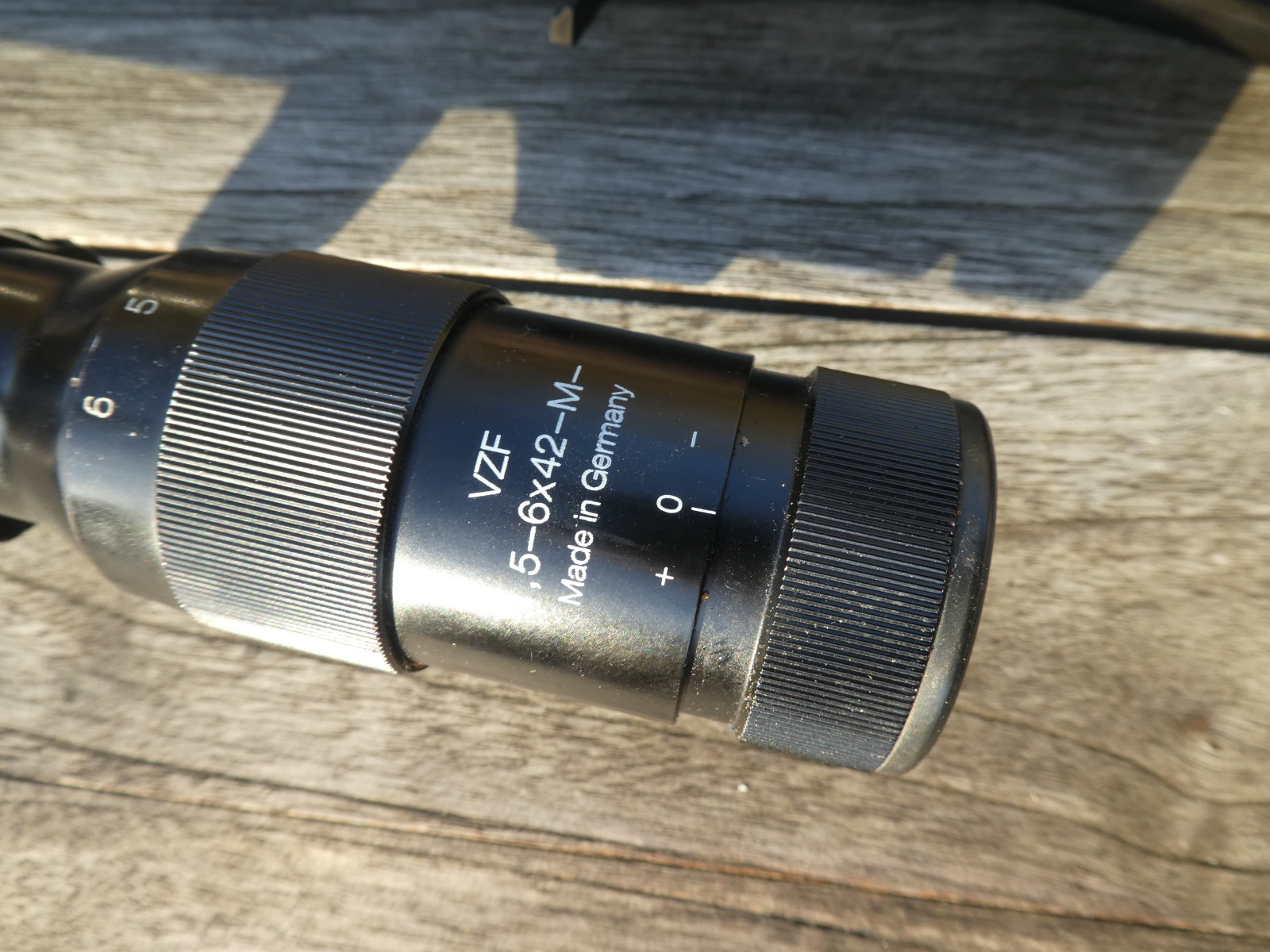 Abzug funktioniert als Rückstecher, Waffe in einem für das Alter tadellosen Zustand, sowohl optisch als auch technisch. Auf einer Schwenkmontage ist ein Zeiss VZF 1,5-6x42-: , Absehen 4 Glas montiert.