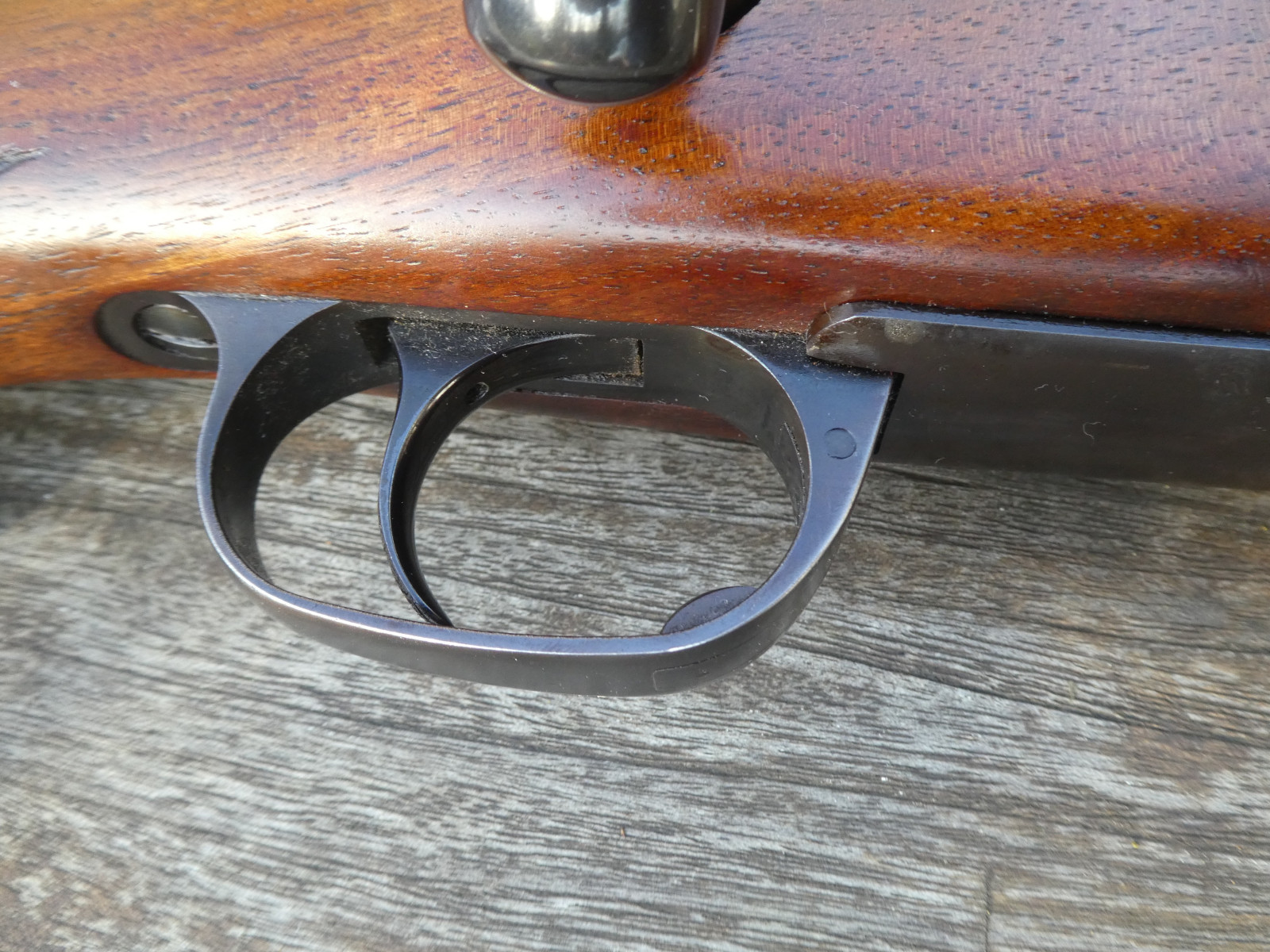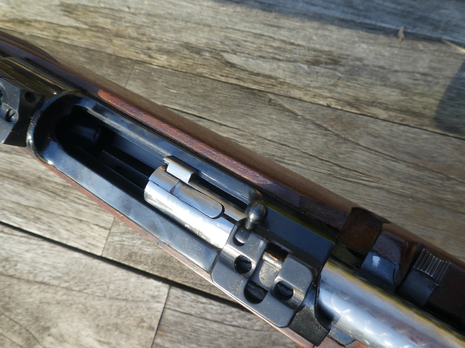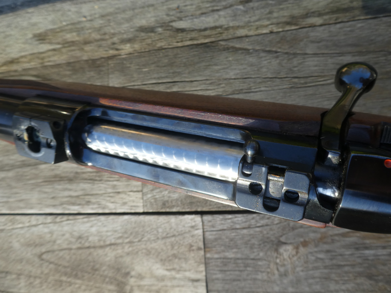 Abzug funktioniert als Rückstecher, Waffe in einem für das Alter tadellosen Zustand, sowohl optisch als auch technisch. Auf einer Schwenkmontage ist ein Zeiss VZF 1,5-6x42-: , Absehen 4 Glas montiert.