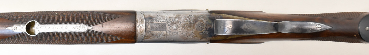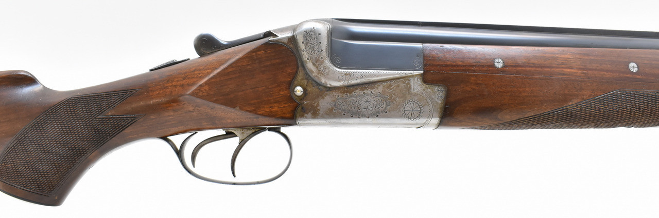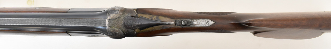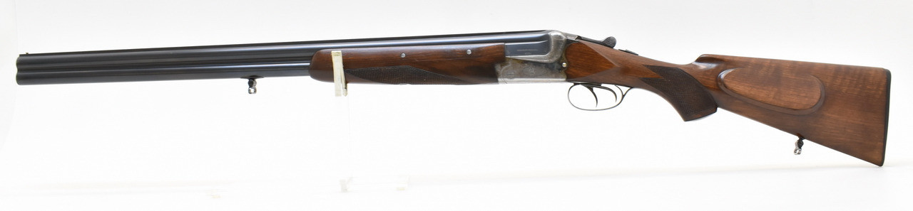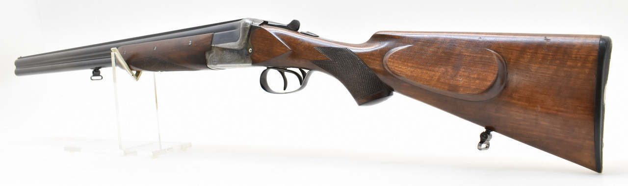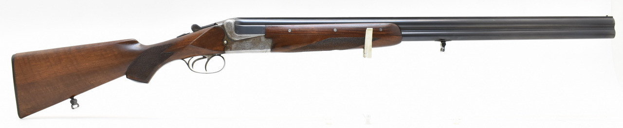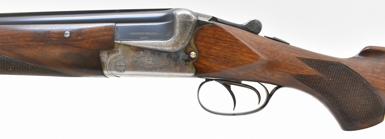 Merkel Bockflinte mit Doppelabzug, vorderer mit Gelenk und Ejektor. Die Läufe sind spiegelblank, der Verschluss stramm. 3/4-voll Choke, geteilter Vorderschaft. Signalstifte zur "gepannt" Anzeige. 36,5cm langer englischer Nussbaumschaft. (Gemessen vorderer Abzug bis Mitte Schaftkappe) Beschuss von 08/1971.