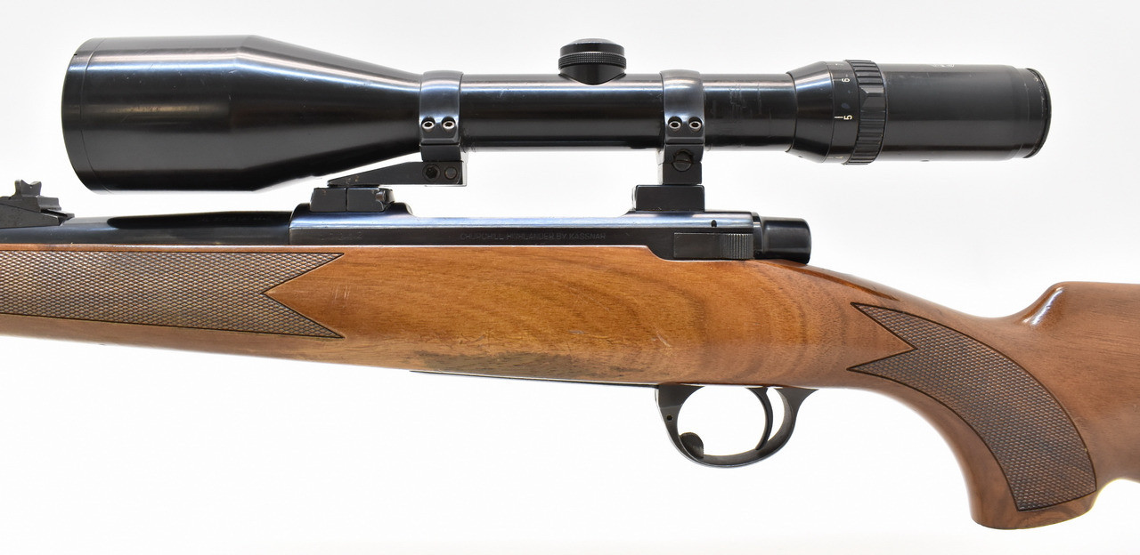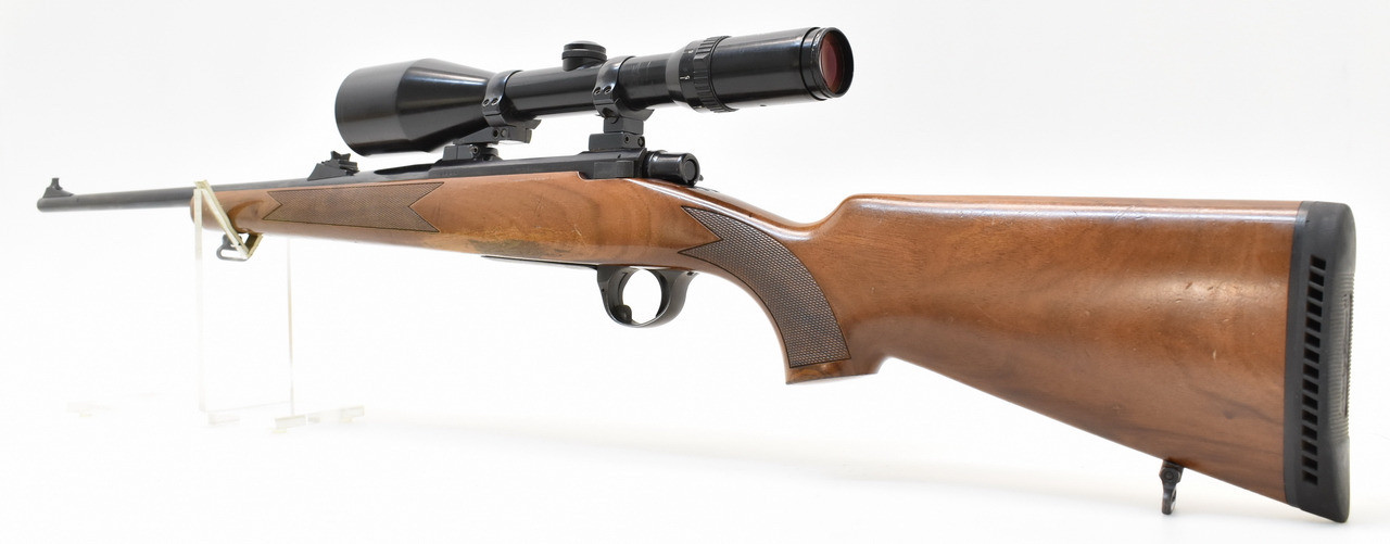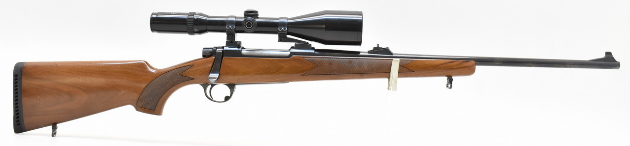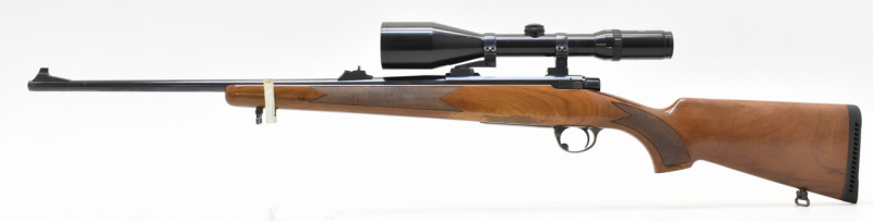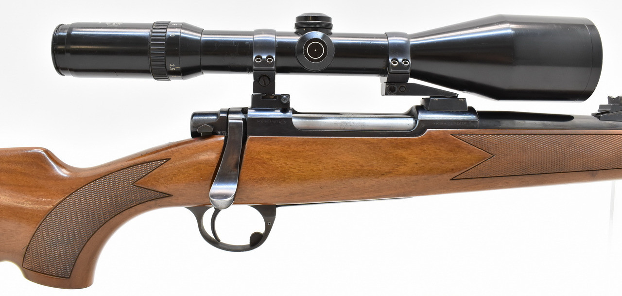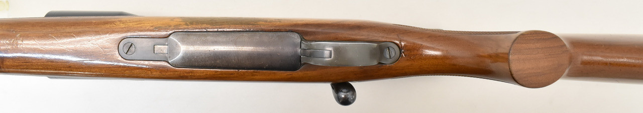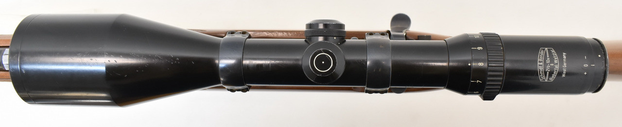 Repetierer mit Druckpunktabzug und seitlicher Sicherung. Spiegelblanker Lauf, am Kammerstängel leicht beriebene Brünierung. Montiert auf einer Schwenkmontage ist ein Schmidt&Bender ZF 2,5-10x56 Abs. 1 34,5cm langer Schaft ohne Backe mit Pistolengriff. ( gemessen vorderer Abzug bis Mitte Schaftkappe) Beschuss von 1990.