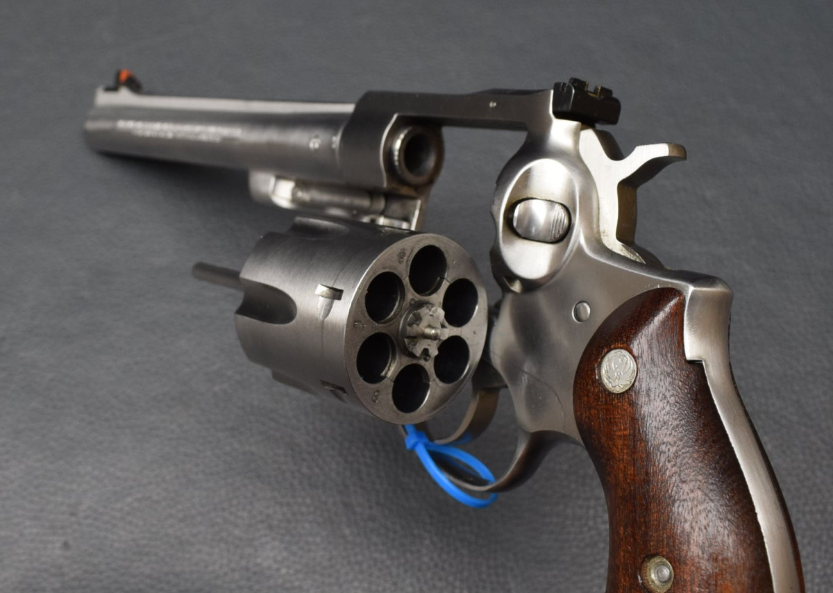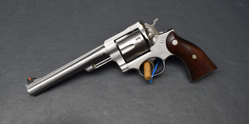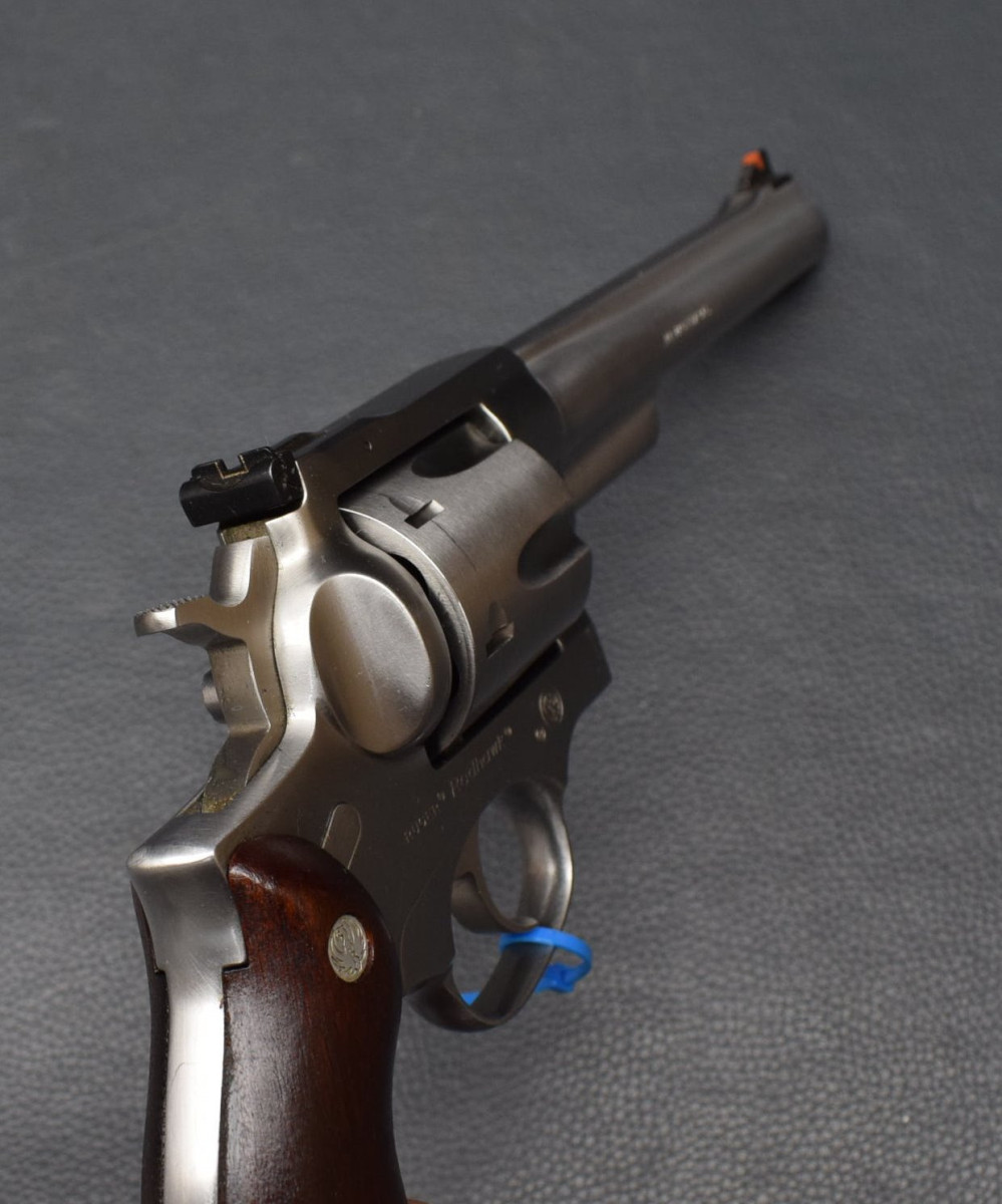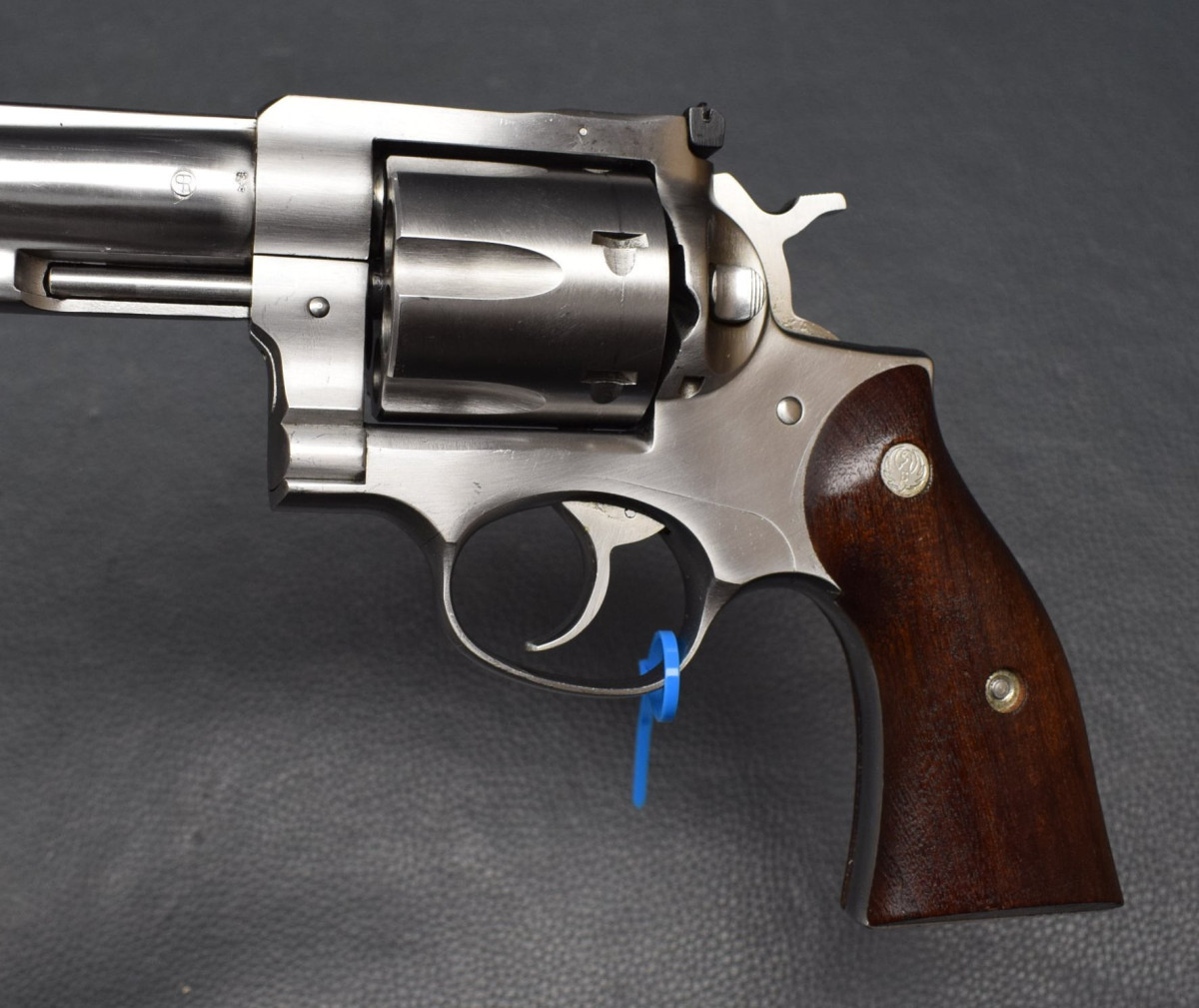 Holzgriffschalen mit Ruger Logo. Lauf und Trommelbohrungen sehr gut, Oberfläche 97%