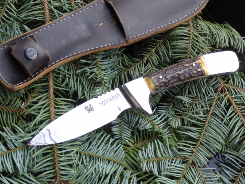 Sie bieten auf ein Jagdmesser der Marke Northman mit Droppoint Klinge, geschmiedet aus 80CrV, polierte Klinge, Heft und Knauf. Mit echten Hirschhorn Griffbacken. Dazu gibt es eine handgenähte Sattellederscheide.