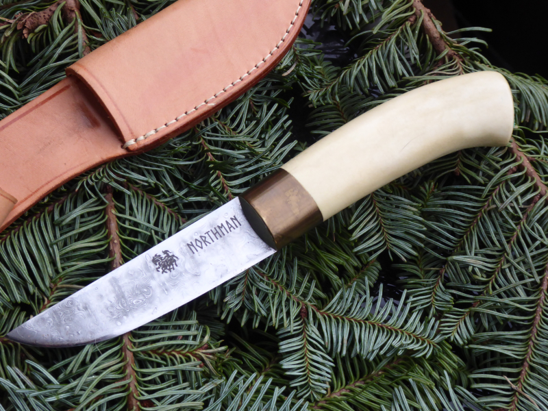Sie bieten auf ein nordisches Damast Jagdmesser der Marke Northman, geschmiedete Klinge aus Nickel- / Kohlenstoff Stahl Damast. Wildes Damast Muster, 128 Lagen.