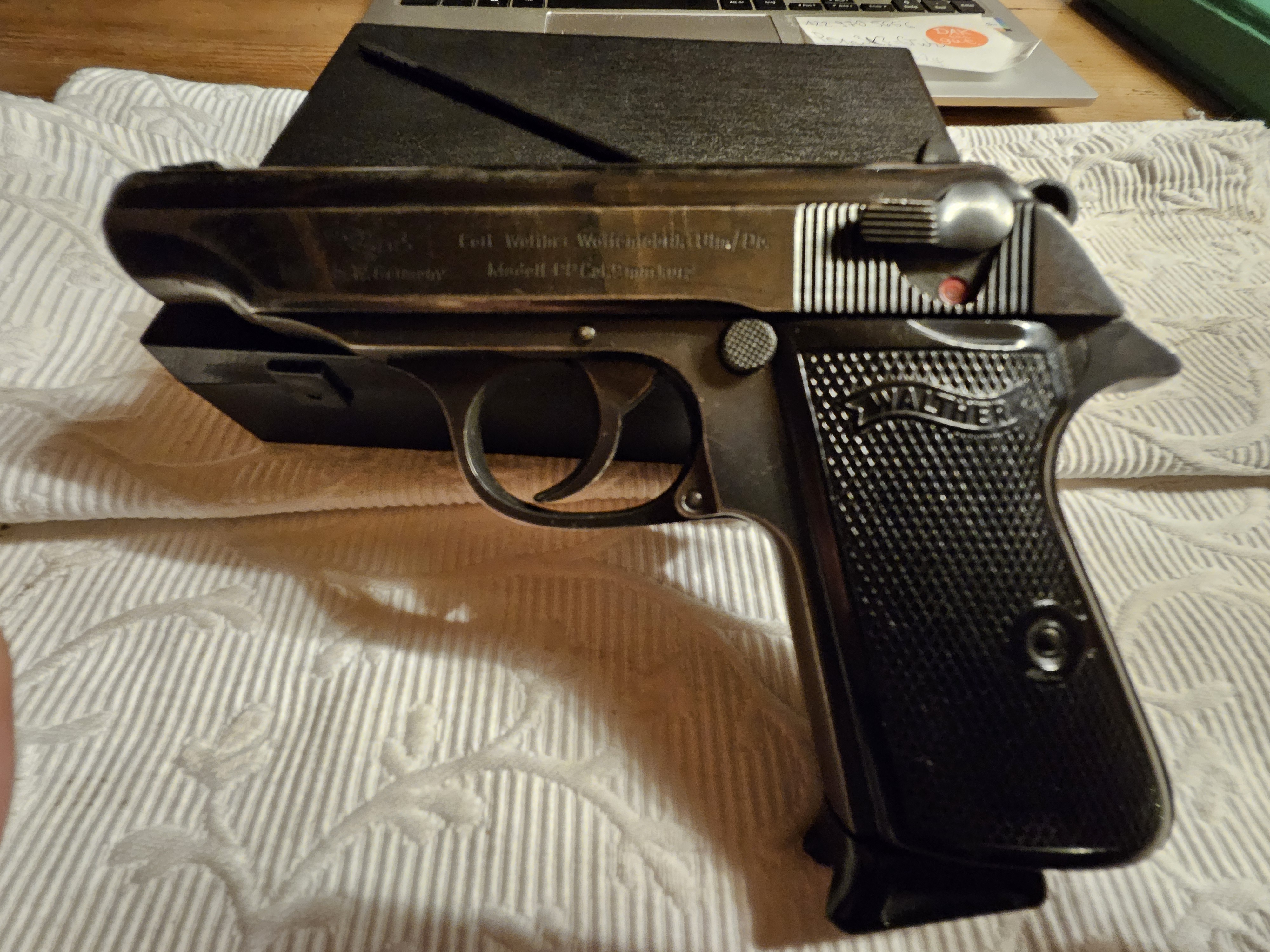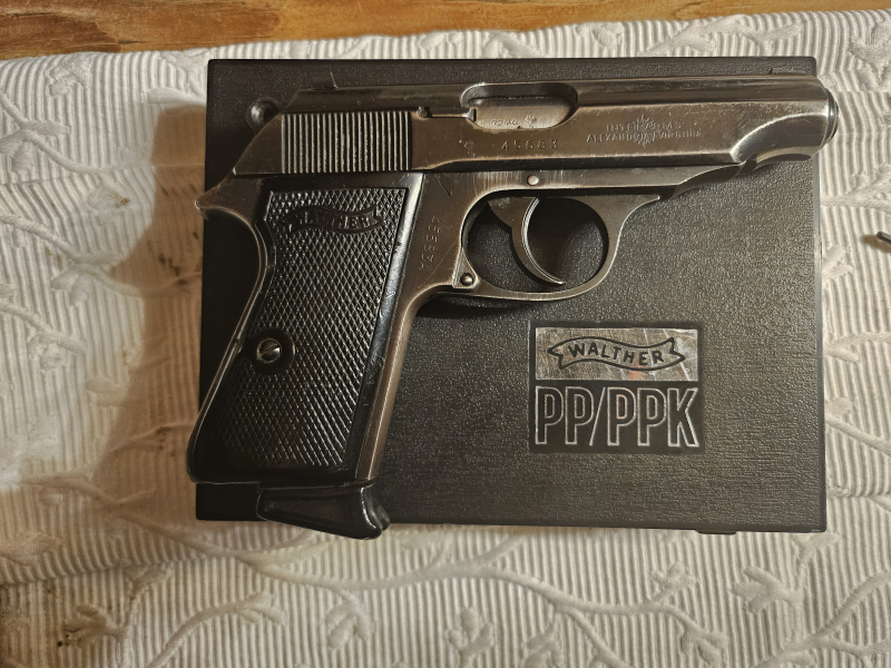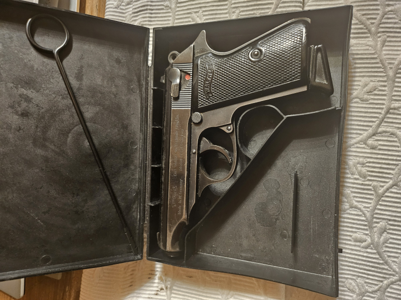 Sammlerwaffe. Walther 9mm kurz von 1972 - nummerngleich, soweit ich erkennen kann. Auf der re. Schlittenseite: Wappen von INTERARMS,ALEXANDRIA - VIRGINIA. Deutscher Beschuss von 1972. Interessante Fangschusswaffe auch für Jäger. Wird in der abgebildeten Box versteigert. Versand außerhalb der BRD nur über lizenzierten Deutschen Waffenhändler.