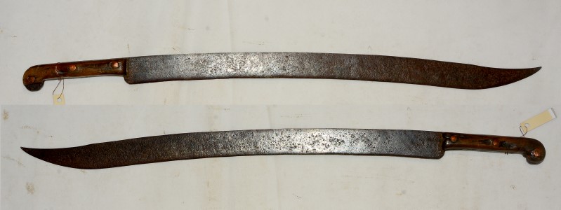 Langes Yatagan Haumesser, 50,5 cm lange geschwungene Klinge und angenietete Holzgriffschalen, die Klinge mit Rostnarben und am Knauf ein Holzabbruch