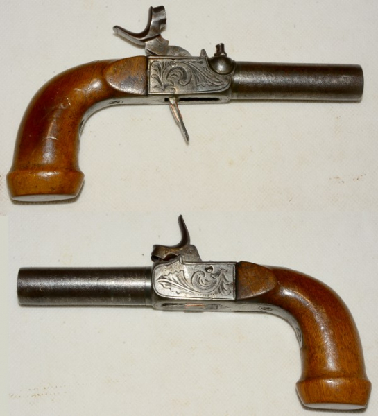 Perkussionsterzerol, abschraubbarer Lauf (sitzt aber fest), Kasten mit Gravur und Lauf mit geprägtem Rosendamastmuster, Lauflänge 6,1cm, Gesamtlänge 17cm, Kaliber 1,5 mm, der Klappabzug wurde vor einiger Zeit repariert, die Funktion ist gut