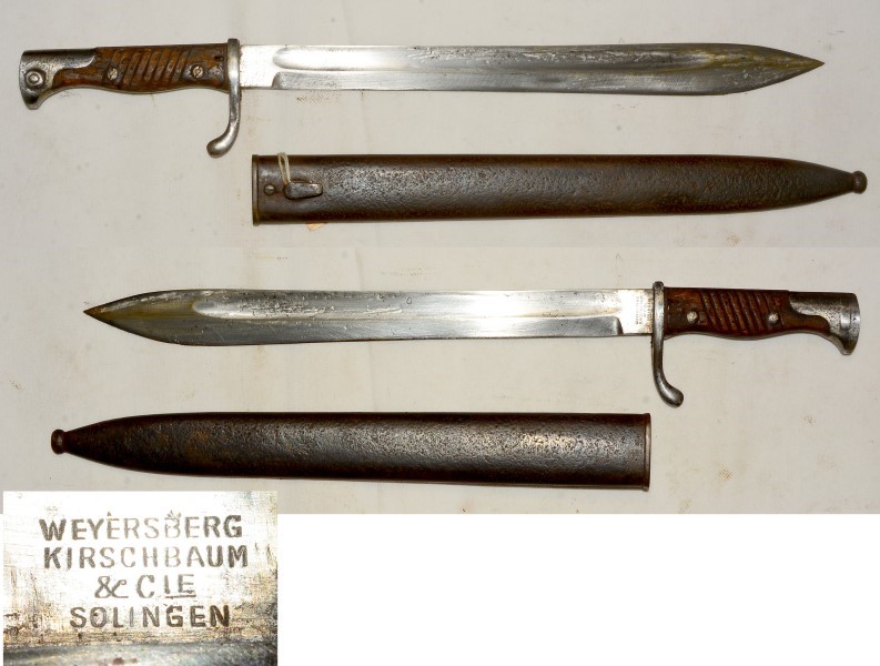 Deutsches Bajonett 98/05 2. Art, Hersteller "Weyersberg Kirschbaum & Cie Solingen", Klinge im vorderen Bereich leicht narbig, die Holzgriffschalen mit Tierfraß und die Scheide rostig