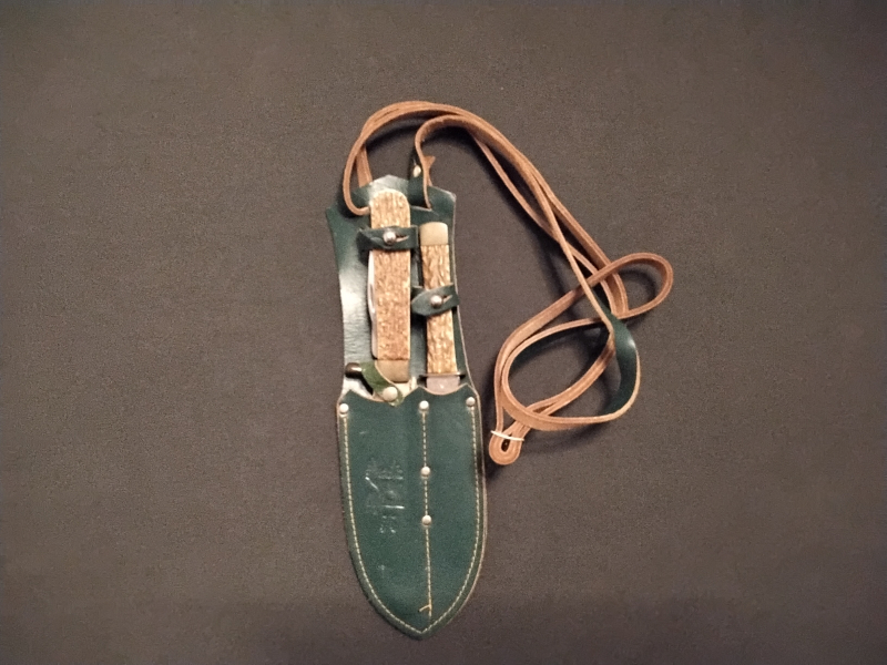Waidbesteck bestehend aus einem mehrteiligen Waidmesser mit Säge und Aufbruchklinge und einem einteiligen Jagdmesser mit dazugehöriger Lederscheide. Das Waidmesser hat eine Gesamtlänge von ca. 25 cm und die Hauptklinge ist ca. 13,2 cm lang. Das Jagdmesser hat eine Gesamtlänge von ca. 21,5 cm und eine Klingelänge ist ca. 11,6 cm. Auf der Rückseite der Lederscheide befindet sich ein Stempel von dem man nur "VEB Metallwerk" entziffern kann, der Rest ist für mich leider unleserlich.