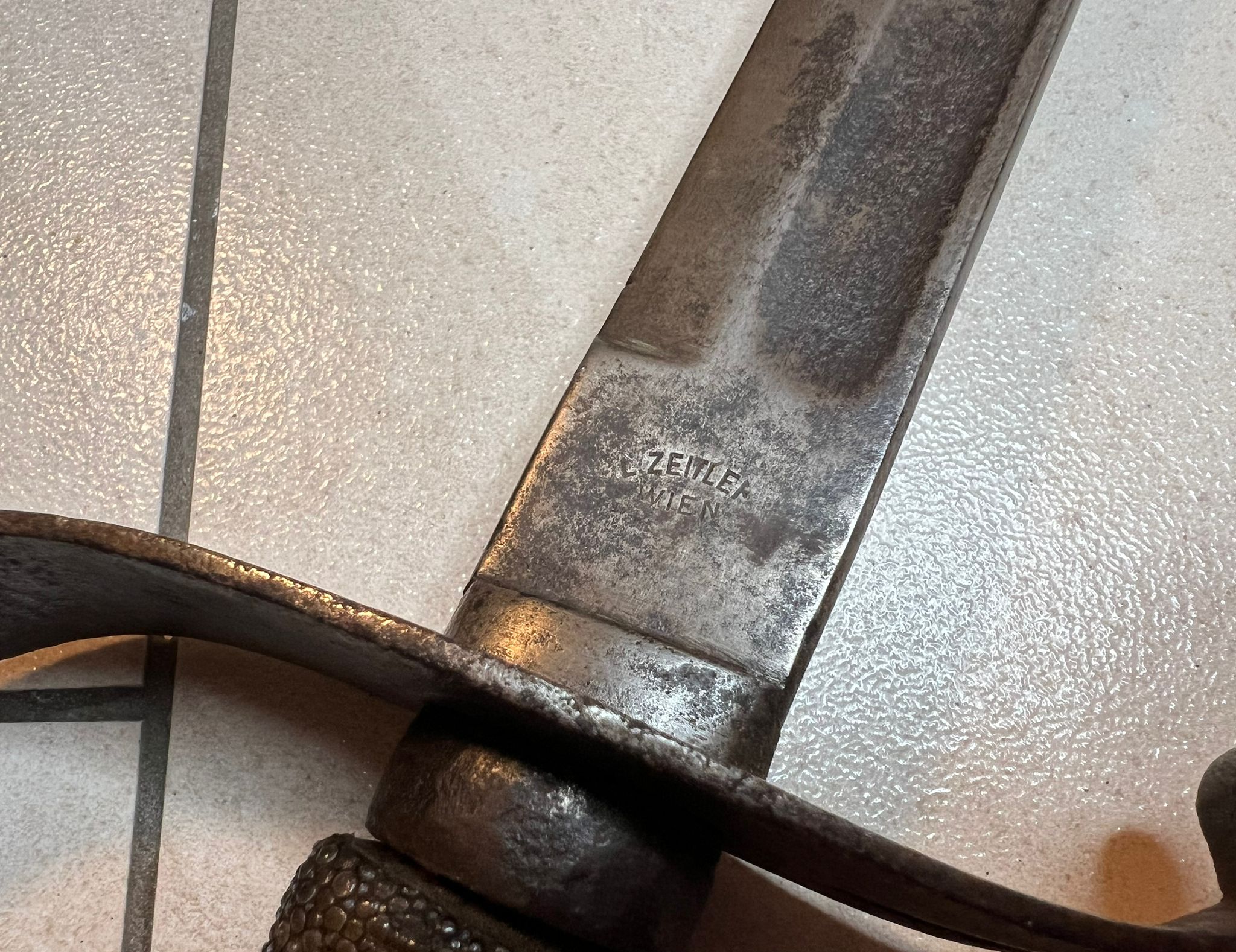 Hierbei handelt es sich um folgende Blankwaffe: Art: Säbel / Österreichischer Kavalleriesäbel Leichter Art / Gattung M1877 Herkunft: Österreich um 1915 Hersteller: L. Zeitler Wien Abnahmestempelung: W.n Doppeladler 15 Regiment: Mir leider Unbekannt Gesamtlänge: ca. 91cm Klingenlänge: ca. 76,5cm Zustand: Bitte anhand der Bilder entnehmen Allgemein: beidsteitig gekehlt, eisernes Bügelgefäß, Griffholz mit Rochenhaut, über dem Stemep W.n Doppeladler 15 steht noch CXLII / Ausgestattet wurden damit die "reitenden Batterien". In diesen Einheiten waren auch die Kanoniere beritten und ein kriegsmäßigen Einsatz mit der Kavallerie geplant.