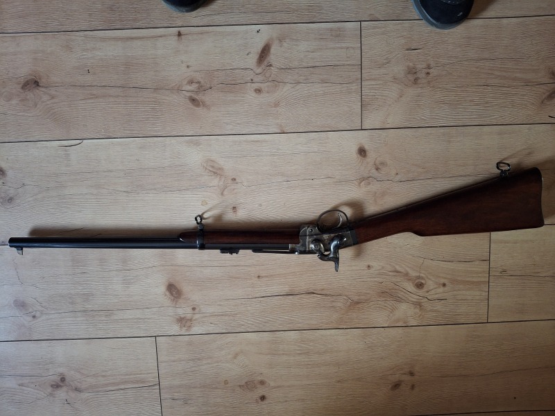 Ich biete hier meinen Smith Carbine Artillerie cal. 50 von Pieta an. Er wurde nur sehr wenig geschossen und ist, bis auf ein paar kleine Dellen im Schaftholz in einem guten Zustand. Der Systemkasten ist Buntgehärtet, die Brünierung 100% und Tiefschwarz. Der Lauf innen ist Spiegelblank. Die Markungen sind wie beim Original angebracht. Die Bilder sind teil der Auktion. Ich lege noch 5 Ladehülsen und ein paar Geschosse mit dabei. Bin Privatverkäufer, deshalb keine Garantie oder Gewährleistung. Nach eingang der Zahlung und erbrachtem Altersnachweis per Mail bringe ich das Paket dierekt zur Post Die Bilder erscheinen bei egun alle auf dem Kopf. Man kann sie auf der Abgespekten Verkaufsplattform nicht mehr drehen.