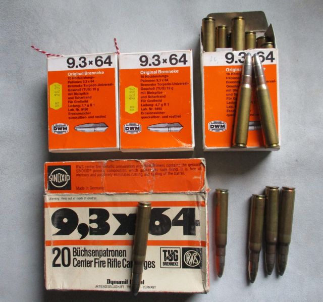 Angebot für den Eguner mit der Suchanzeige ( oder weitere Interessenten): 49 Patronen 9,3x64, Geschoss 19 g TUG. Alle Patronen sind einige Jahrzehnte alt, sind gut erhalten und haben bisher immer einwandfrei geschossen. Ich brauche sie nicht mehr, da im HessenForst Bleifrei vorgeschrieben ist und für den Schießstand sind die Patronen zu stark. Es handelt sich um 3 Päckchen (30 Schuss) Großwildpatronen von DWM, davon sind 2 Päckchen ungeöffnet; sowie um 19 Schuss von RWS. Die RWS dürften dem Aussehen nach aus verschiedenen Päckchen stammen. Wie abgebildet. Gegen EWB.